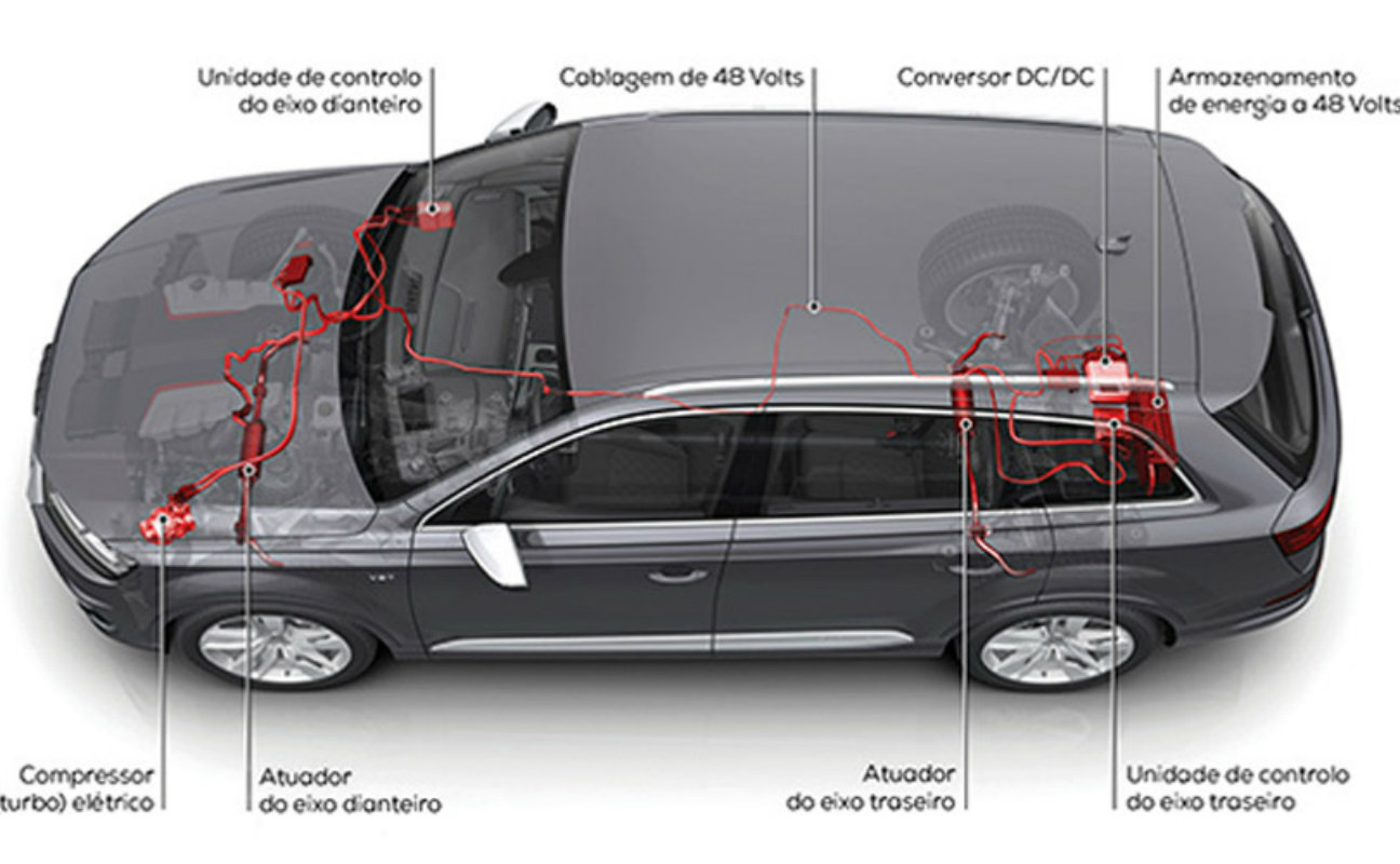 Em termos práticos é impossível alcançar potências elevadas se trabalharmos com tensões reduzidas uma vez que obriga a usar cabos mais grossos para manter a resistência elétrica e a queda de tensão ao longo da rede para valores aceitáveis. Ao escolhermos 48 volts elegemos uma boa combinação entre o benefício de ter uma potência elétrica maior e uma segurança que não põe em perigo as pessoas, nomeadamente ao nível da assistência. Por exemplo, uma rede de 60 volts já requer cuidados suplementares para evitar eletrocussões. Com este aumento de potência também é possível usar sistemas híbridos com maior autonomia elétrica, bem como outros órgãos que permitem melhorar o comportamento do automóvel e o seu desempenho do ponto de vista ambiental. A barra estabilizadora ativa é um exemplo paradigmático, pois até agora tem-se recorrido a uma variedade enorme de sistemas para controlar o rolamento da carroçaria. O primeiro foi estreado no Série 5 da BMW, seguido de muitos outros. A barra estabilizadora ativa elétrica, alimentada pela rede de 48 volts, realiza a mesma função de forma mais rápida, ao mesmo tempo que consome muito menos energia. Os primeiros modelos a terem um sistema destes foram o Bentley Bentayga e o Audi SQ7, que partilham a mesma plataforma.