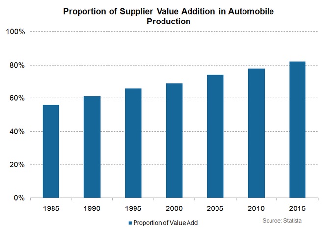 Os fornecedores já representavam, em 2015, mais de 80% do valor acrescentado em cada carro, o que diz bem da sua importância. Elementos como o projecto, design e engenharia ainda nascem no berço da marca, assim como a generalidade dos motores, mas quase tudo o resto é fabricado por fornecedores externos, numa tendência que foi crescendo com a globalização. À medida que os países emergentes iam ganhando pujança durante a década passada, foram os próprios construtores quem incentivaram os seus fornecedores a criarem cada vez mais fábricas locais; no fundo, foram eles quem estimulou o seu crescimento.