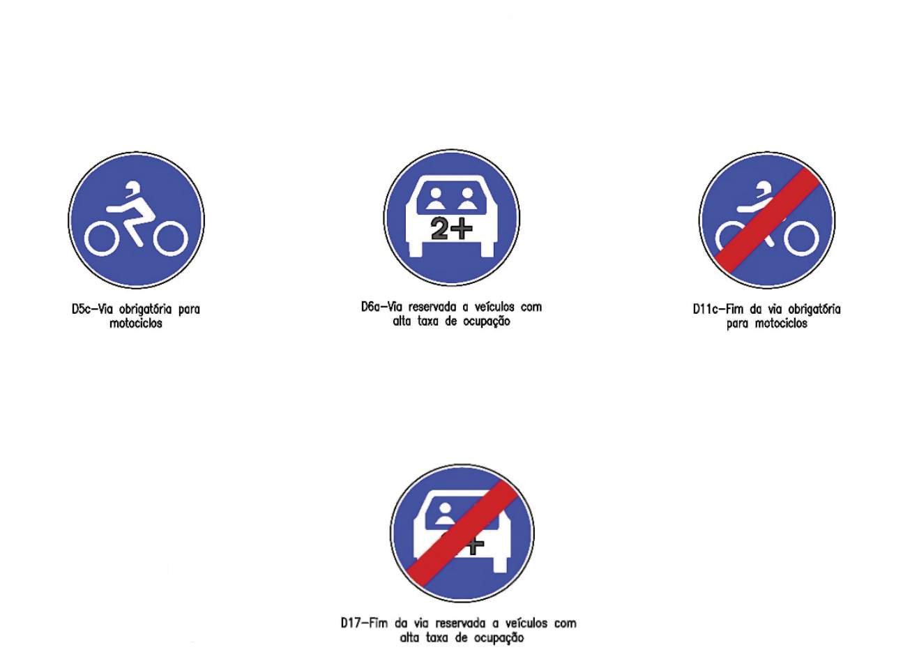 Já nos novos sinais de obrigação destacam-se os que indicam uma via obrigatória para motociclos e uma via reservada a veículos com alta taxa de ocupação.