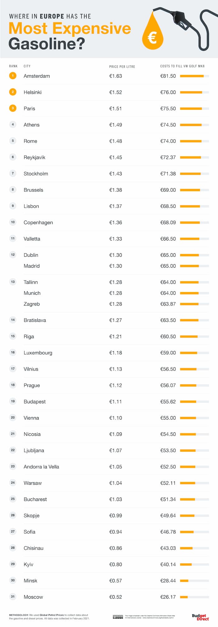 O Global Fuel Index 2021, criado com base na análise do custo de vida em 31 capitais europeias e na comparação dos preços globais dos combustíveis – procurando achar os valores médios para cada país –, coloca Lisboa entre as cidades com a gasolina mais cara, atribuindo-lhe o preço médio de 1,37€ por cada litro. Significa que atestar um automóvel no nosso país tem um custo médio de 68,50€, contra 81,50€ que é o que custa o depósito de gasolina em Amesterdão, capital dos Países Baixos.