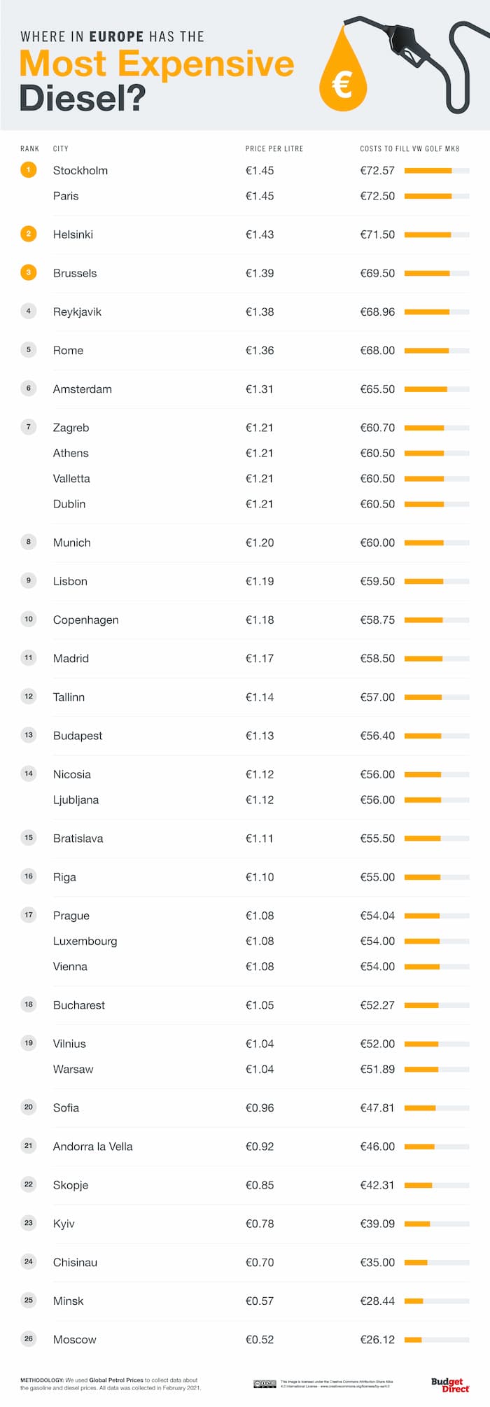 O ranking europeu muda ligeiramente na comparação aos preços do gasóleo. Estocolmo (Suécia) e Paris sobem à primeira posição, com um custo médio de 1,45€ pelo litro de Diesel, enquanto a capital dos Países Baixos (1,31€) é a sexta mais cara. Lisboa, com o custo médio de 1,19€ por litro de gasóleo, mantém o nono posto.