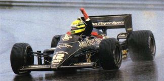 Placa da asa traseira do Lotus 97T que Senna conduziu em...