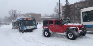 São precisos três jipes para desencalhar um autocarro preso na neve