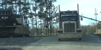 Veja este camião de mercadorias ser colhido por um comboio