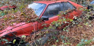 Vários carros clássicos abandonados nos terrenos de uma casa ardida