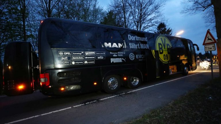 Fonte da polícia diz que foram usadas três cargas explosivas quando o autocarro estava a caminho do estádio Signal Iduna Park.