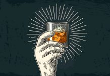 A imagem de consumo de whisky é de um copo largo e baixo com duas pedras de gelo, na mão de alguém sentado na...