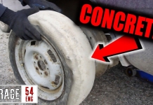 Russos do Garage54 experimentaram usar cimento em vez de borracha para fabricar os quatro pneus de um automóvel. O resultado foi desastroso, pois claro...