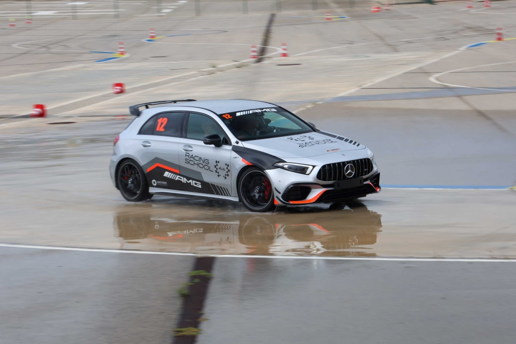 Agora, a primeira volta é ao lado do piloto-instrutor—«50% a 60% do limite…», adianta Edgar Gonçalves—, sendo importante fixar quase tudo. Para que lado é a curva, onde se trava, onde se entra, onde se sai, onde está a reta, onde está o volante. Onde? O Mercedes-AMG A 45 S (421 cv) não se importa com a esfrega e, meu Deus!, se isto é a metade do limite. Brutal. Foi tudo tão rápido, suave e certinho, que me esqueço de quase tudo e não me recordo de quase nada. Baralhado? Sim. Troco de posição, aí está o volante, modo Race ativado e ‘lá vou eu’—acelero como quem não quer a coisa. E o pior é que quero (e muito) e assim que a voz autoritária do piloto-instrutor me entra pela cabeça adentro, pelo intercomunicador, só tento ouvi-lo. A pista passa a ser virtual, não está lá, o asfalto desaparece, não há vivalma nas bancadas e estou tramado: «trave, trave, mais forte, com força! Fechar pela esquerda, saímos à direita, acelere, acelere, trave agora, suave, progressivo, travagem forte, forte! Trave a direito, ao fundo, fechar pela direita, sair à esquerda. Sem travar, só volante, pouco, pouco, agora, confie, vá, agora, acelere, acelere!». A pista nem sequer lá está.