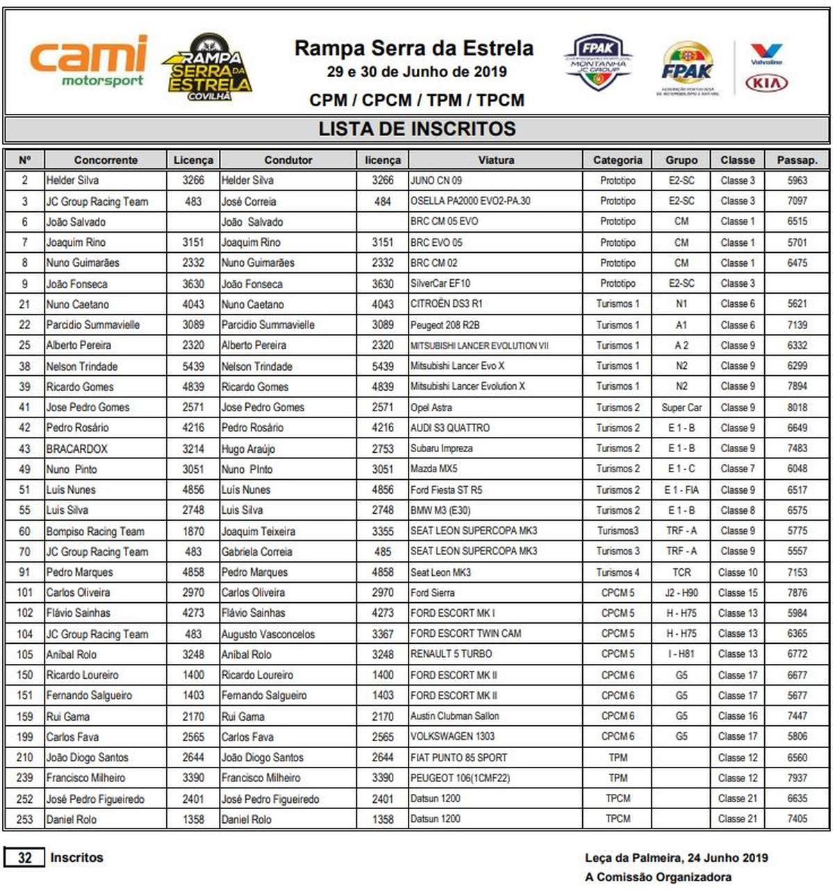 Na lista de inscritos da edição deste ano, que tem um total 32 de concorrentes, estão todos os grandes protagonistas do CPM, tanto no campeonato absoluto, como nas categorias Protótipos e Turismos. A Rampa Serra da Estrela é também a quarta prova pontuável para o Campeonato de Portugal de Clássicos de Montanha, Taça de Portugal de Clássicos de Montanha e Taça de Portugal de Montanha 1300.
