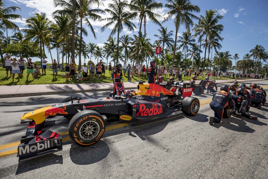 Curiosamente, a Red Bull já havia passado pelas largas estradas de Miami em 2018, numa ação promocional, como se pode ver na imagem de abertura deste artigo, então já com Max Verstappen aos comandos.