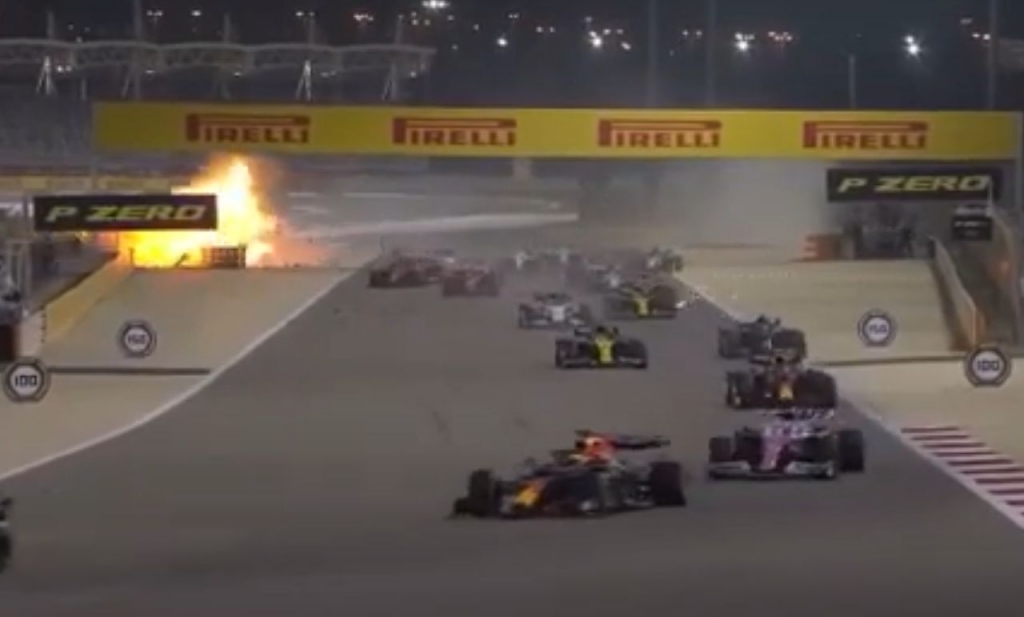 O Grande Prémio do Bahrein foi interrompido ao cabo de escassos metros, depois de um incrível e pavoroso acidente sofrido por Romain Grosjean (Haas) pouco depois do arranque.