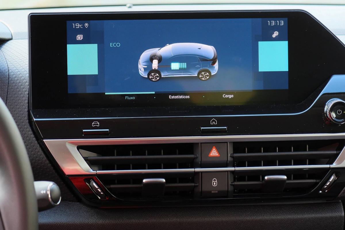 Com uma bateria de 50 kWh, o ë-C4 argumenta com uma autonomia estimada em ciclo WLTP de 350 quilómetros, que nos parece relativamente exequível desde que se suavizem os ímpetos do pé direito e se utilize o relevo e o modo de regeneração ‘B’ da caixa para ‘acumular’ uns quilómetros suplementares na bateria de iões de lítio. Num percurso de 38 quilómetros, com passagens urbanas e via rápida, o computador de bordo indicou-nos um consumo médio final de 16 kWh/100 km, em linha com os 16.6 kWh/100 km anunciados pela marca. Bom indicador. Ainda relativamente ao capítulo da autonomia, nota para uma diferença mais ou menos de 30 quilómetros entre os modos de condução ‘Eco’ e ‘Sport’, sendo esse o número que o modo mais desportivo retira à autonomia estimada no modo económico.