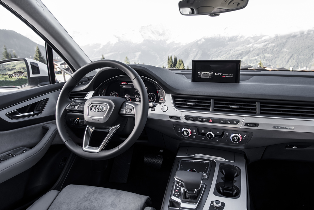 No interior a sensação de espaço é nota dominante e a primeira sensação que fica na retina. Nos lugares dianteiros o centro é ocupado pela consola de generosas dimensões, que nos disponibiliza os meios para aceder a todas as informações disponibilizadas pelo ecrã MMI-Display, que surge do tablier sempre que ligamos o veículo. Podemos optar pela utilização do botão giratório para o efeito, ou dos botões de rádio; média; telemóvel e Nav/Mapa junto do MMI all-in-touch de controlo com uma superfície táctil – no fundo, falamos de um touchpad semelhante aos dos computadores, mas que requer alguma habituação até estarmos perfeitamente em sintonia com o seu manuseamento.