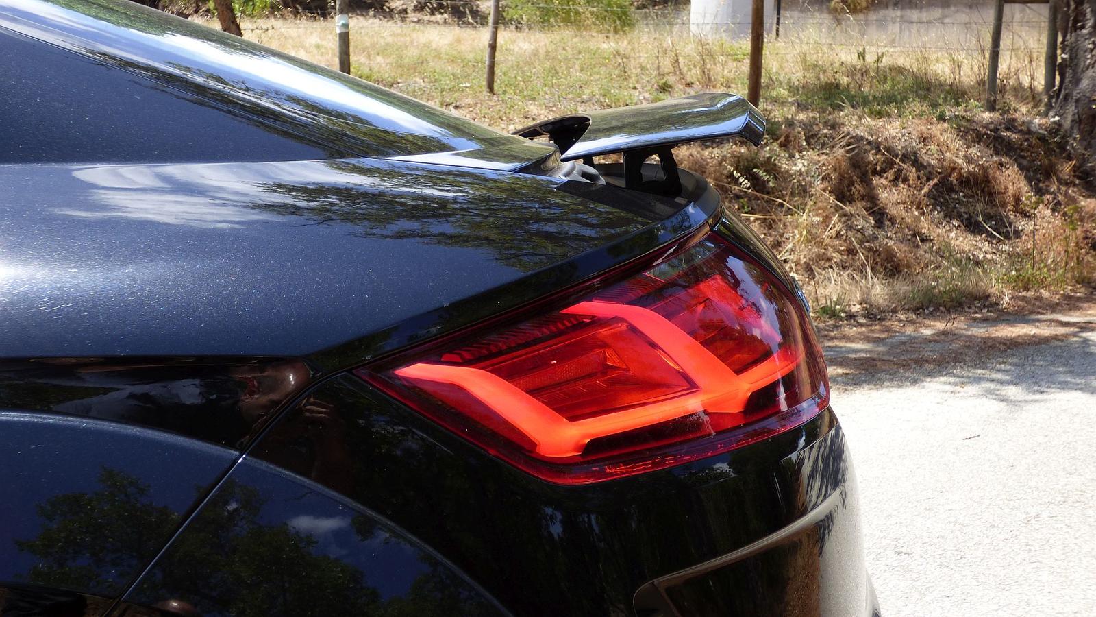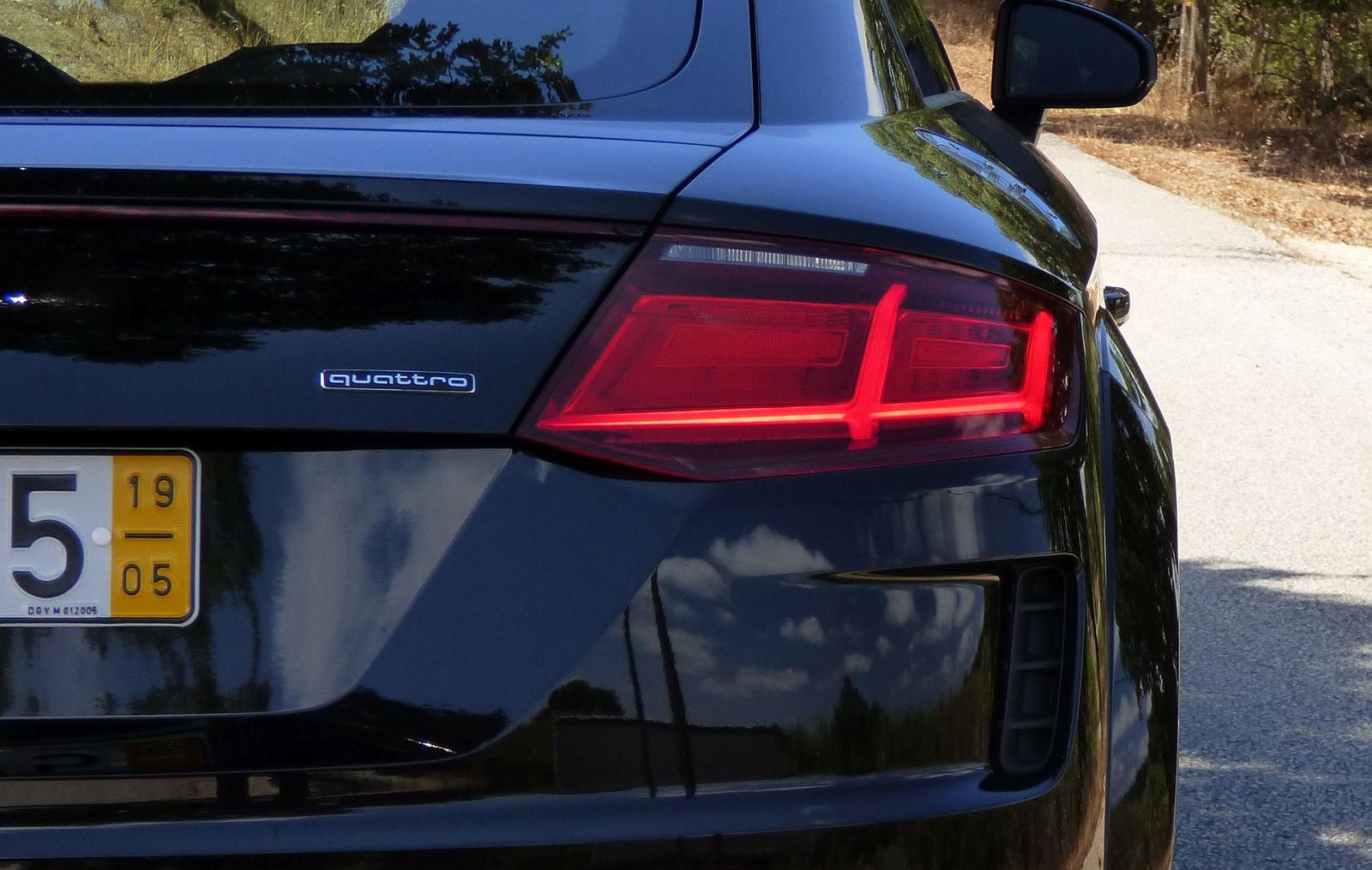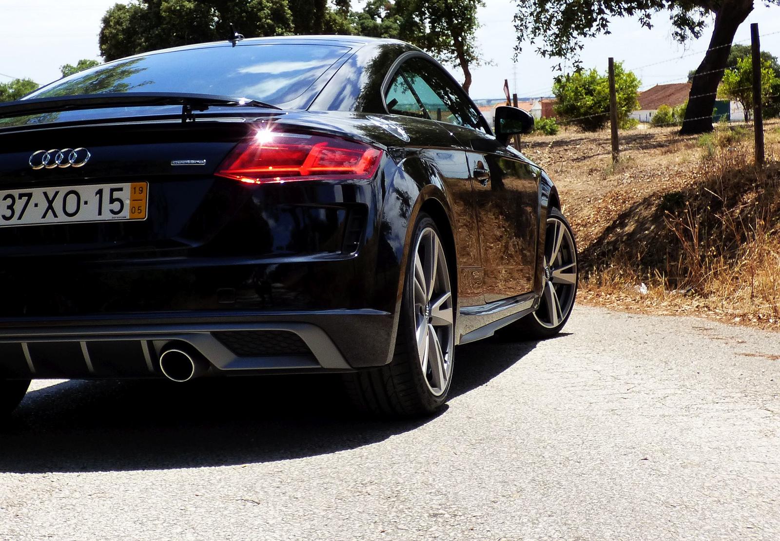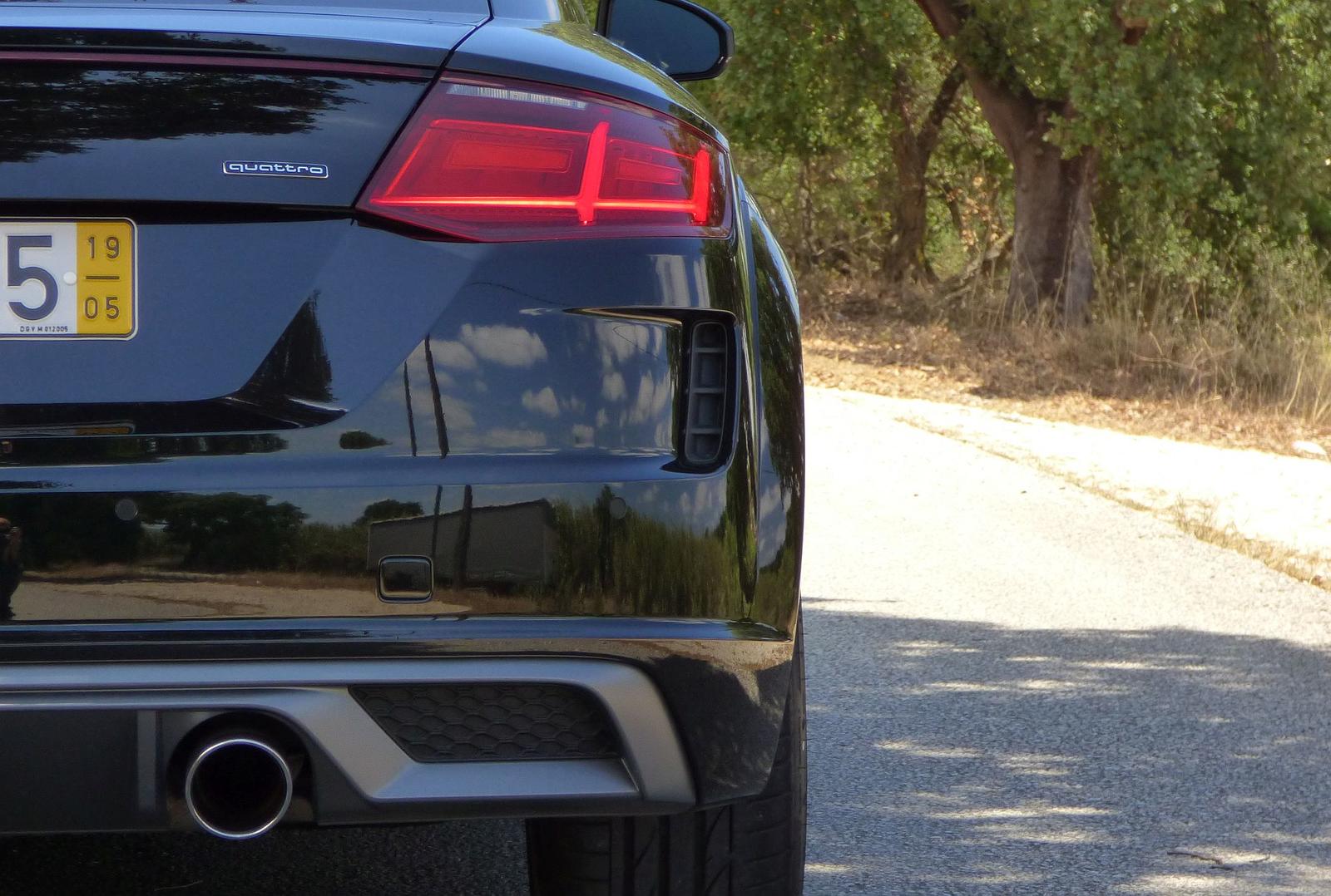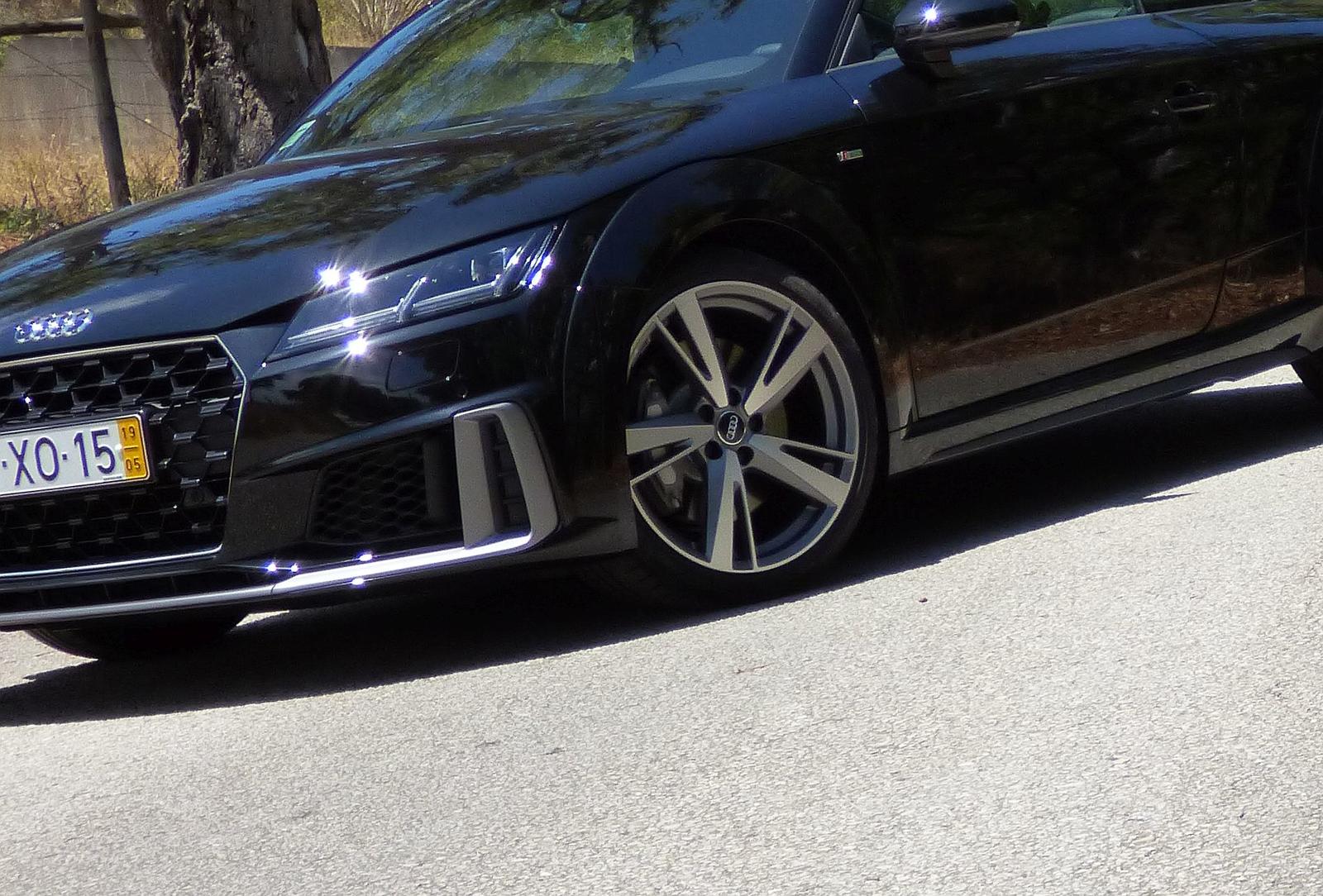 Com ares de R8 em versão mais diminuta, o renovado TT é, mesmo, um chamariz para diversos olhares, que são atraídos pelos faróis de Matriz LED, pela grelha Singleframe hexagonal desportiva e ampla, ladeada por entradas de ar agressivas, mas também pelas jantes de 19 polegadas (conjunto por 1610€), pelas saias laterais e, na traseira pelas duas saídas de escape redondas, pelo difusor e pelo spoiler retrátil situado na tampa da bagageira. A este propósito, irritante detalhe o de nunca termos conseguido abrir o porta-bagagens por fora ou com o botão da chave com a ignição ligada. Apenas com o motor desligado se abriu…