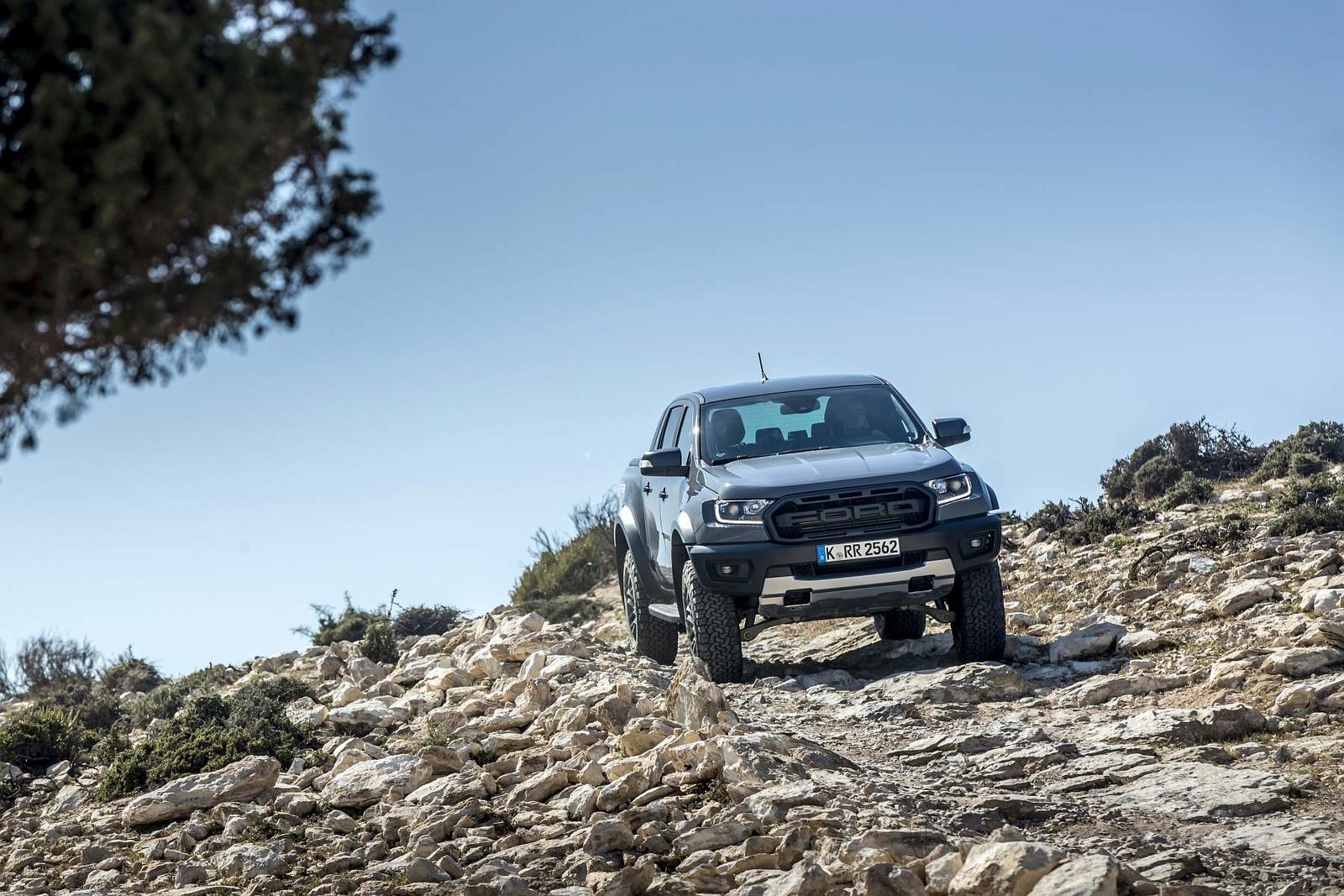 Saindo do asfalto, esta Raptor está em casa e os limites são muito elevados. Seja em trilhos mais técnicos, com lama ou pedra, ou em troços mais rápidos, esta pick-up mantém-se sempre eficaz e tranquila. O sistema de Gestão de Terreno adapta a resposta do acelerador, da caixa automática de 10 velocidades – consegue a proeza de manter o 2.0 biturbo sempre no regime ideal – e da suspensão aos diferentes tipos de piso. O sistema tem seis modos: Normal, Sport, Grass/Gravel/Snow, Mud/Sand, Rock e Baja. Este último podia perfeitamente chamar-se “Race” ou “Fun”. O 2.0 ganha um novo fôlego, a caixa esquece-se que é automática e passa de relações como se fosse uma caixa sequencial de competição e a suspensão fica pronta para saltos e estradões de terra a alta velocidade.