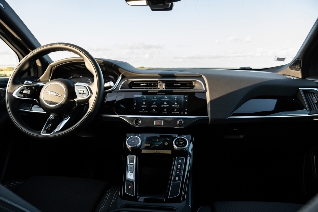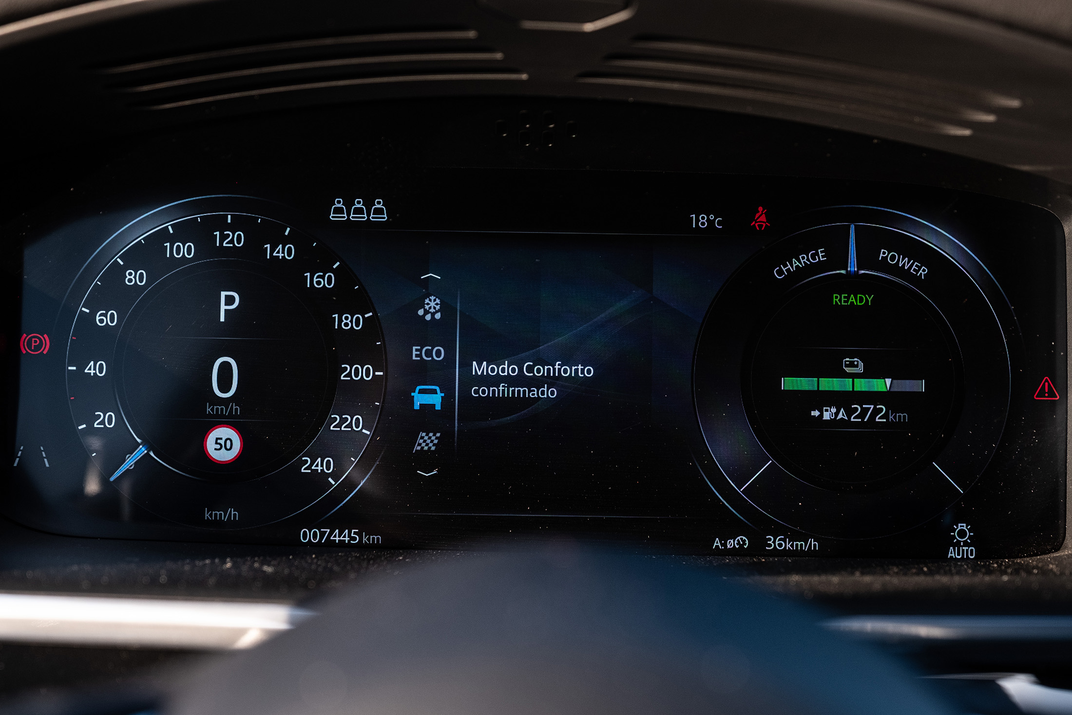 Uma vez instalados no lugar do condutor existem nada menos do que três ecrãs, em que podemos ver diferentes tipos de informações, tudo controlado pelo novo sistema Pivi Pro que conta com ligação permanente 4G para receber atualizações over the air e opcionalmente um plano para acesso à web e serviços de streaming. O quadrante totalmente digital pode ser configurado para mostrar toda a informação relevante, além do velocímetro, assim como o GPS. Nos outros dois ecrãs tácteis, no principal superior de 10” controla-se todo o infoentretenimento; no inferior, mais pequeno de 5”, e não tão prático de utilizar (pois obriga a olhar para baixo) é utilizado, sobretudo, para controlar o sistema de climatização.Prontos para arrancar, podemos escolher entre os modos Eco ou Dynamic, sendo o primeiro aquele com que se conseguirão obter melhores consumos, logo uma maior autonomia. Ao fim de algum tempo de habituação à condução do i-Pace damos por nós a utilizar apenas o pedal do acelerador até mesmo para quase parar, utilizando o método que a marca chama de “condução com apenas um pedal”: utiliza a travagem regenerativa sempre que desaceleramos para carregar as baterias, a qual pode ser configurada de forma a deixar deslizar mais ou menos o carro, conforme a preferência do condutor.