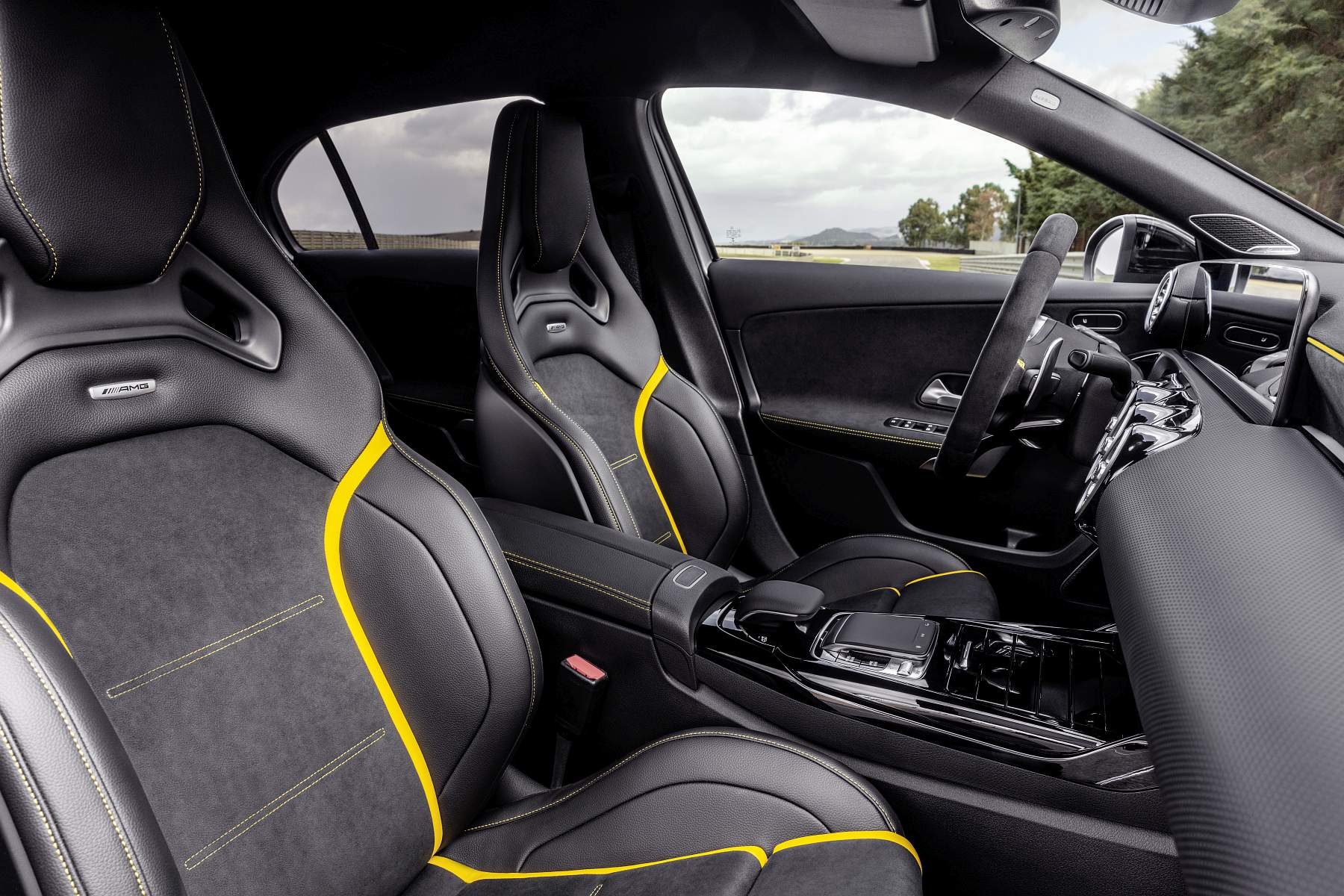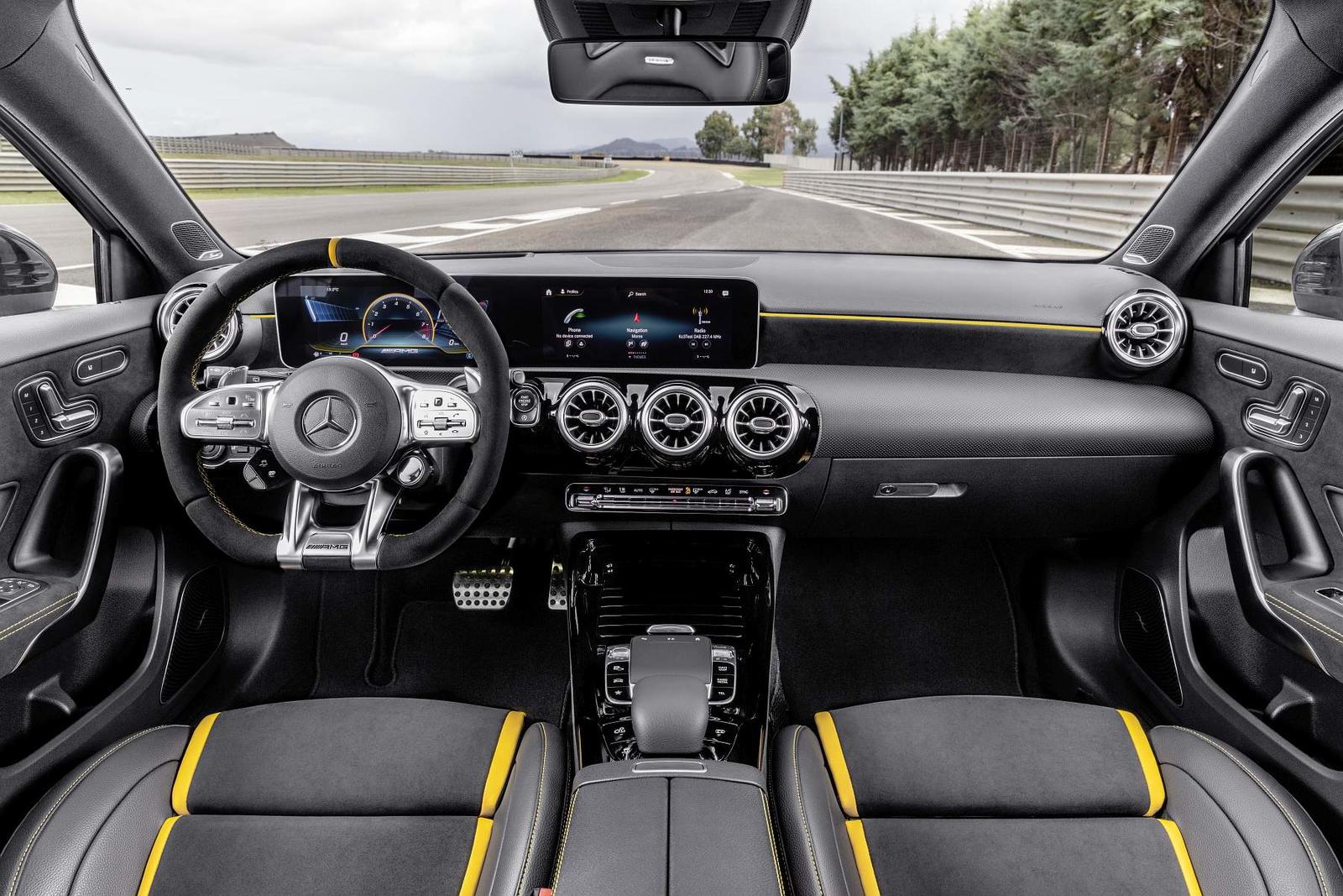 Conquista-nos ao primeiro olhar: a grelha dianteira ‘Panamericana’ agora típica dos AMG, os para-choques volumosos com os splitters laterais para efeitos aerodinâmicos, o capot com as duas saliências, as cavas das rodas mais largas e as saias laterais acompanhadas de jantes expressivas de 19 polegadas, o enorme aileron traseiro (opcional) e o difusor inferior que integra as saídas de escape mostram uma ambição diferente. O cardápio visual do AMG A 45 S 4MATIC+ é impressionante e apenas a cor negra da unidade ensaiada parece contrariar a tendência para sobressair. No entanto, a sua condição quase discreta também lhe assenta bem.