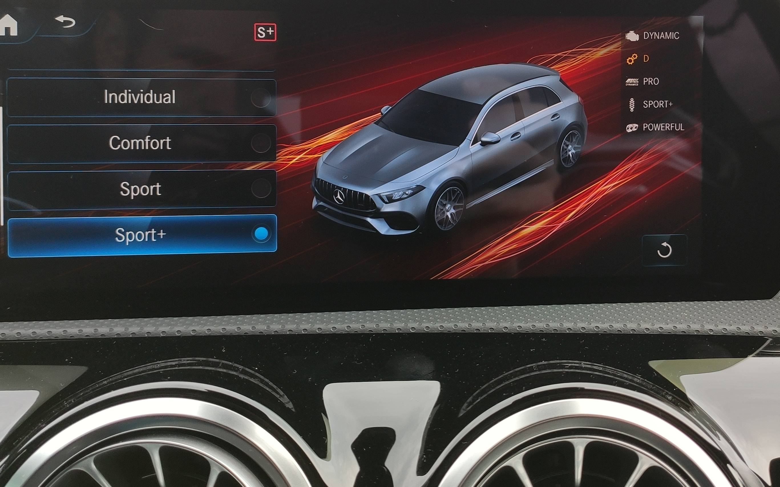 Mas é na mecânica que reside o grande trunfo deste AMG mais extremo, com o motor de quatro cilindros mais potente do mundo em carros de produção em série. Construído em alumínio, este motor de 1991 cc de cilindrada está equipado de injeção direta e de turbo, apresentado no seu cartão de identidade um total de 421 CV de potência e 500 Nm de binário, embora obtidos numa faixa elevada de rotações – entre as 5000 e as 5250 rpm. O sistema motriz fica completo com a caixa de velocidades automática de oito velocidades AMG-Speedshift 8G, com patilhas atrás do volante para comando manual/sequencial.Ao ligar o motor, surge a primeira declaração de interesses. Uma sonoridade rouca proveniente das quatro saídas de escape redondas, que se agrava porém com um toque na tecla de comando da sonoridade do mesmo, que fica em modo ‘Powerful’ (potente). Curiosamente, em cidade, apesar da suspensão desportiva com afinação entre o ‘Comfort’ e o ‘Race’, este Mercedes-AMG não resulta demasiado desconfortável. Firme, por certo, mas quando em modo mais confortável do AMG Dynamic Select, tolerável em pisos mais degradados. O mesmo se pode dizer à entrega da potência: moderada, com a sua energia latente. Como um atleta de sprint a fazer o aquecimento para a sua prova: apenas dá o essencial, reservando o mais importante para depois.