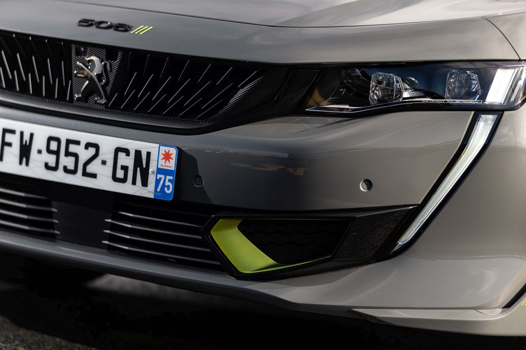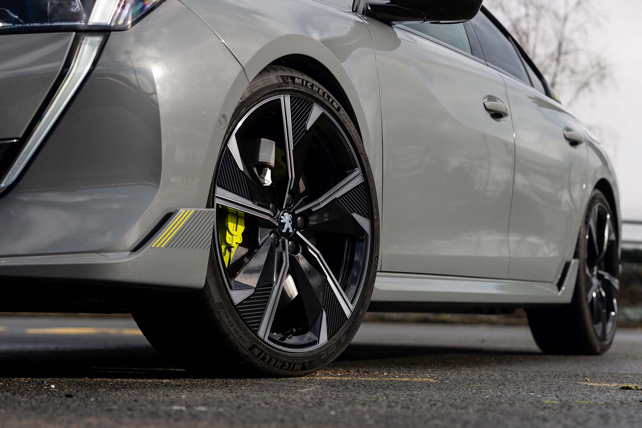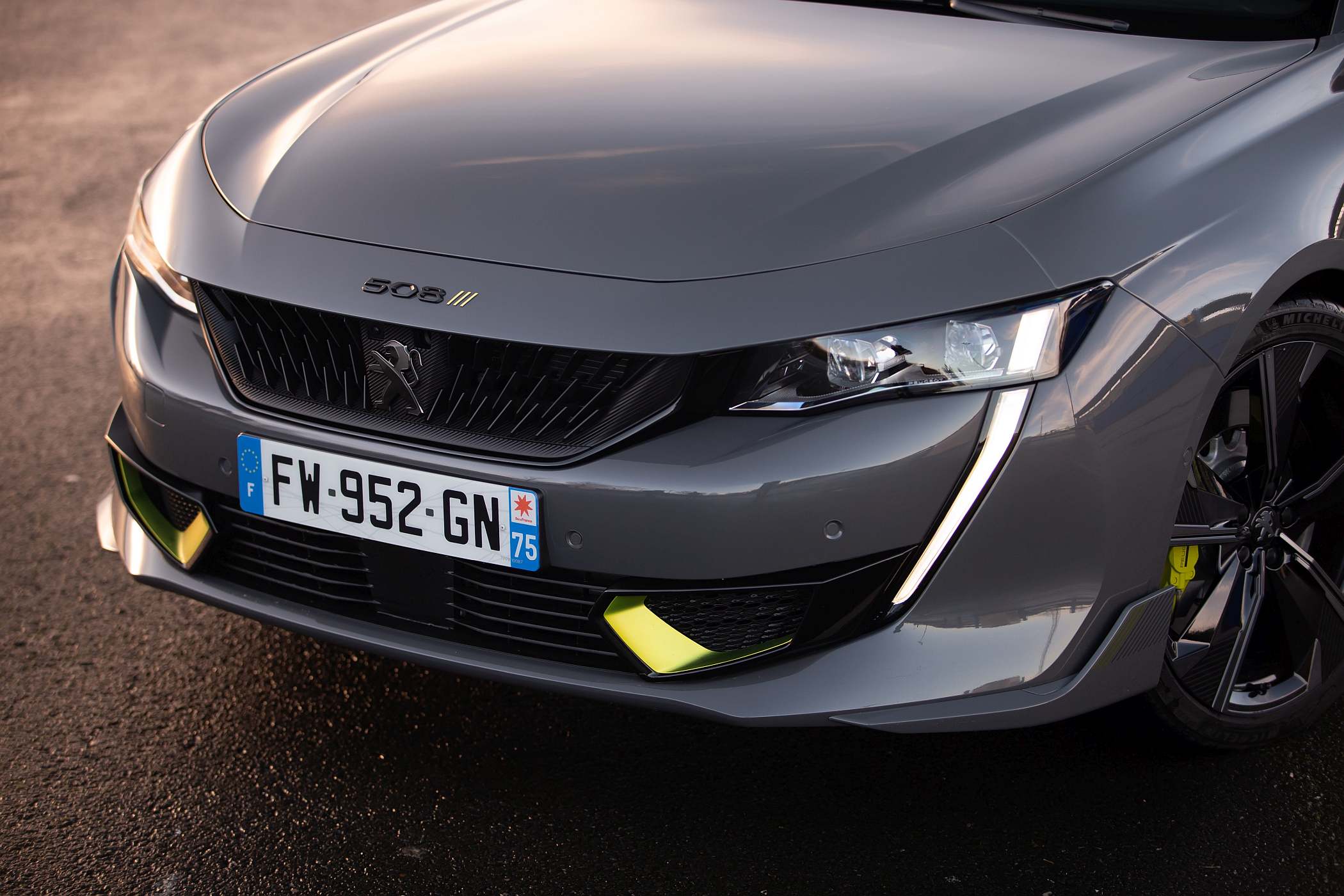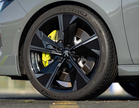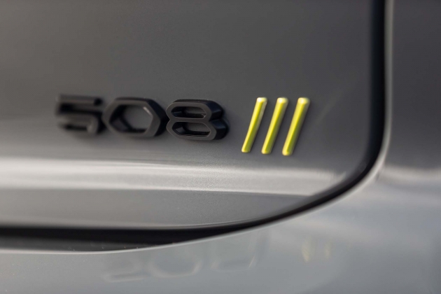 O facto de ter aletas inferiores a toda a volta ao estilo de desviadores de fluxo do ar chama logo a atenção, aliado a uma redução da altura ao solo em 10 mm na dianteira e 1 mm na traseira, a que se juntam ainda as grandes jantes de 20 polegadas com pneus que dispensam o cunho ecológico em prol da performance: para o 508 PSE foram escolhidos pneus Michelin Pilot Sport 4S. A cor exterior de lançamento Cinzento Selenium traduz igualmente uma postura diferente, sublinhada pelos apontamentos em verde florescente, que a marca denomina de Kryptonite, como a que era usada contra o Super-Homem, em contraste com aplicações de cor negra, como na grelha. As três ‘garras’ figurativas também estão espalhadas pela carroçaria – junto à denominação no capot, no volante e no pilar C. A dupla saída de escape – real e não fictícia, como nalguns modelos do género – tem um tratamento a negro.