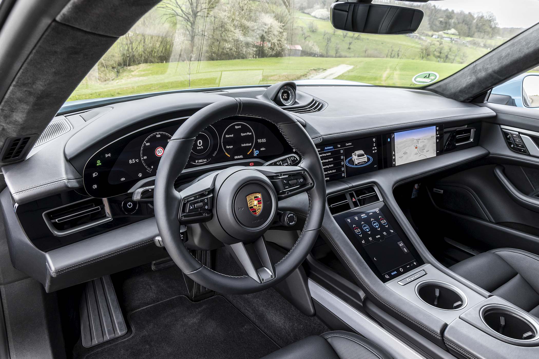 No interior, o design do Taycan Cross Turismo replica o do Taycan, com o painel de instrumentos independente e curvo de grande dimensões, a que se junta, no centro do tablier, o ecrã tátil de 10.9 polegadas, a que se pode juntar ainda um outro ecrã opcional para o passageiro, numa faixa contínua num conceito ‘Black Panel’. Em combinação com o pacote Offroad Design é montada uma bússola no topo do tablier. Nos bancos traseiros, outro dos seus argumentos é a maior altura até ao tejadilho – mais 4,5 cm, que prometem dar maior conforto a ocupantes mais altos nos lugares posteriores.
