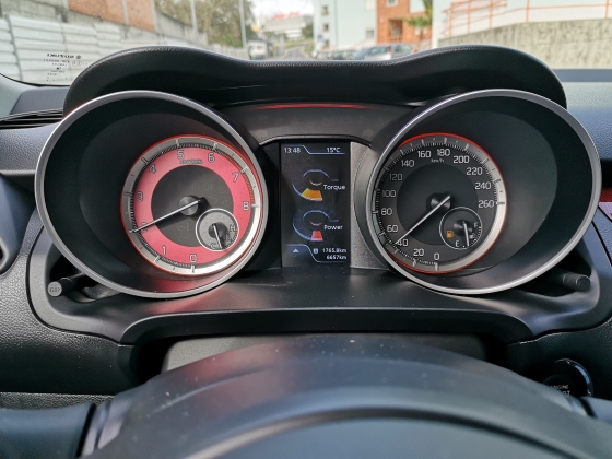 No quadrante de instrumentos temos dois mostradores analógicos circulares e um pequeno LCD ao centro, onde além das tradicionais informações disponibilizadas pelo computador de bordo, podemos ainda ver gráficos animados do turbo, bateria do sistema híbrido, etc. O “infotainment” é-nos apresentado num ecrã tátil de 7 polegadas e tem navegação incluída, bem como Apple Car Play e Android Auto, mas o grafismo tem baixa resolução e todo o sistema de menus fica com um aspeto datado e difícil de operar. Ainda temos comandos do sistema de ar condicionado manuais, por meio de botões rotativos, mas o controlo do volume de som passou a ser tátil, seguindo a tendência atual. O espaço a bordo acomoda quatro adultos ou dois adultos e três crianças na fila de trás, a qualidade dos materiais é razoável verificando-se a existência de alguns detalhes a vermelho na decoração, e muitos plásticos duros, o que é expectável dentro do segmento. A bagageira não é das mais espaçosas, conta com 265 Litros, mas ainda assim é possível arrumar quatro tróleis de cabine. Apesar dos números modestos, com o cronómetro a marcar 9,1 segundos dos 0-100 km/h, o comportamento dinâmico revela-se muito gratificante para quem goste de conduzir em estradas com algum nível de exigência com retas curtas e muitas curvas. Nestas condições, a 3ª velocidade vai ser a nossa melhor “amiga” quando estamos a explorar a faixa de rotação ideal do motor. A direção é precisa e a firmeza da suspensão ajuda-nos a entrar em curva, mas sente-se a reação da traseira às transferências de massa, por isso é preciso uma atenção redobrada caso de desligue o ESP com o piso escorregadio.
