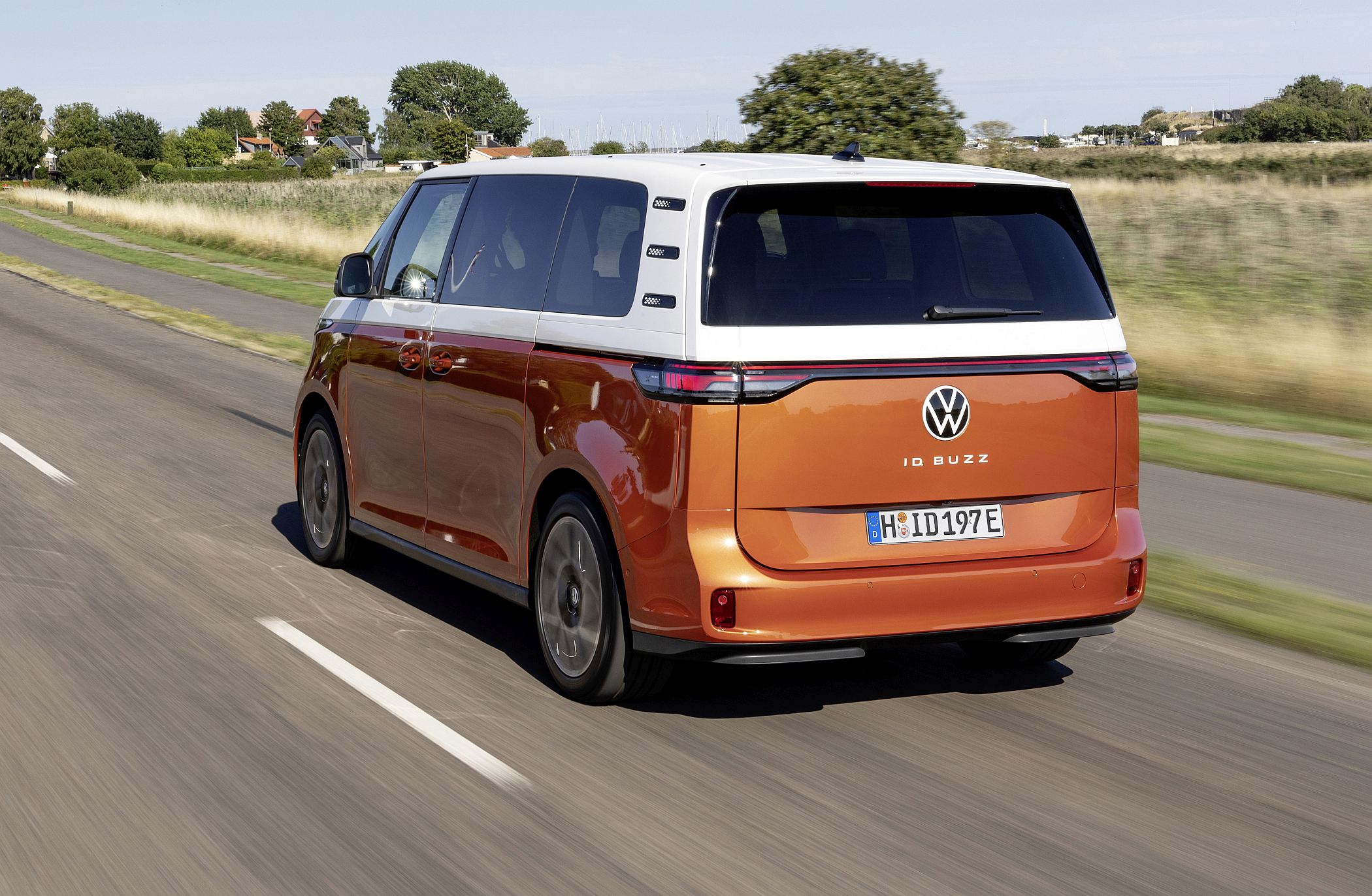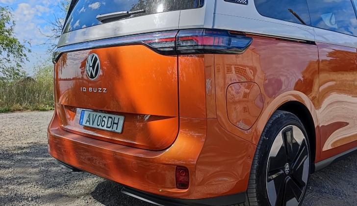 Atrás, com farolins horizontais para salientar a sensação de largura, o ID. Buzz conta pela primeira vez num modelo da Volkswagen Comerciais com uma barra luminosa a unir os dois grupos óticos, sendo a iluminação totalmente em LED. Tudo com a dose certa de revivalismo e de modernidade.