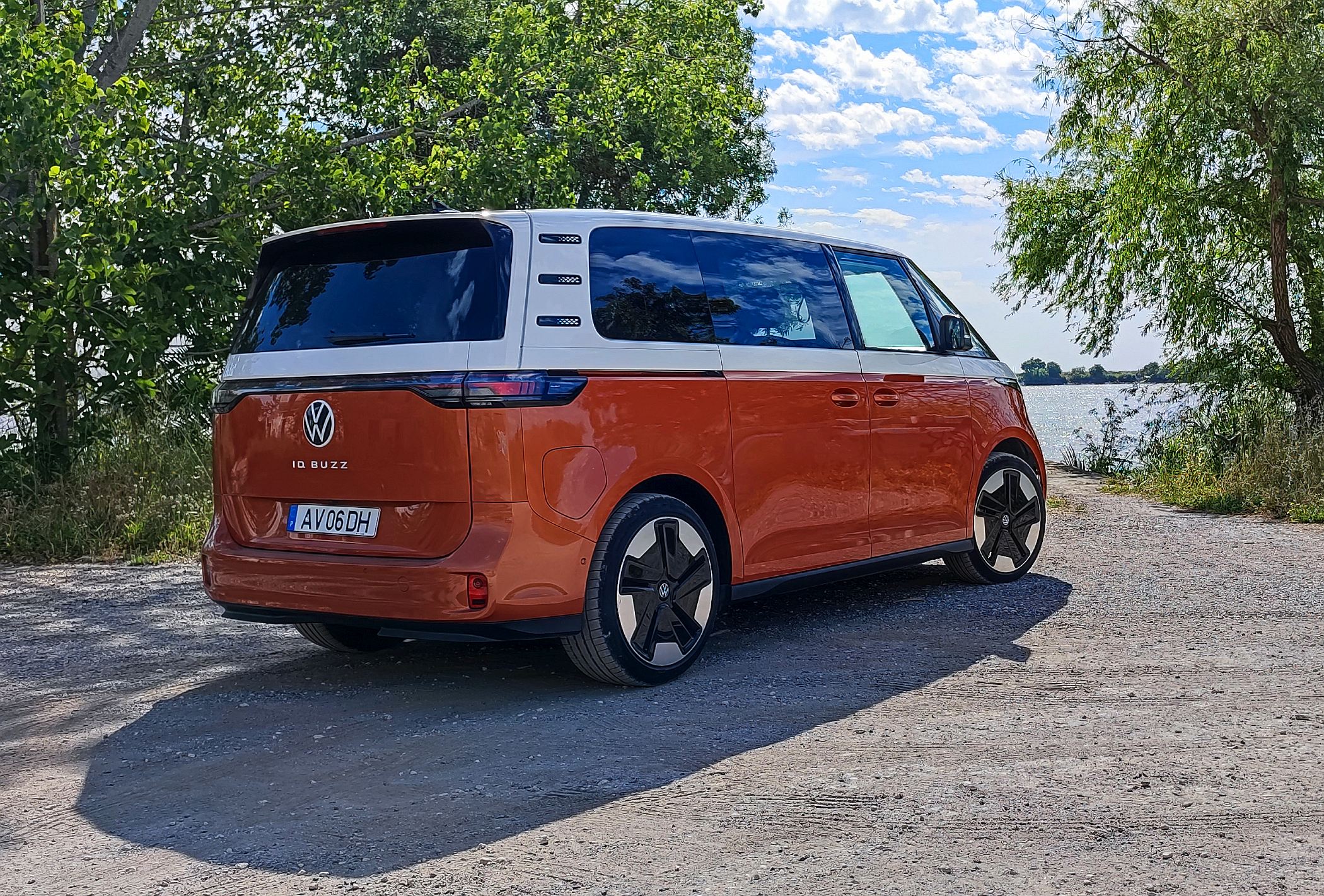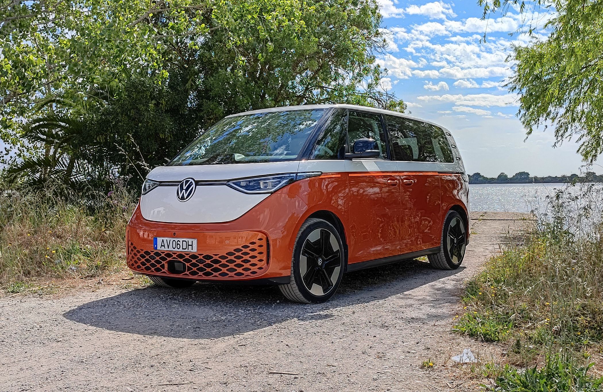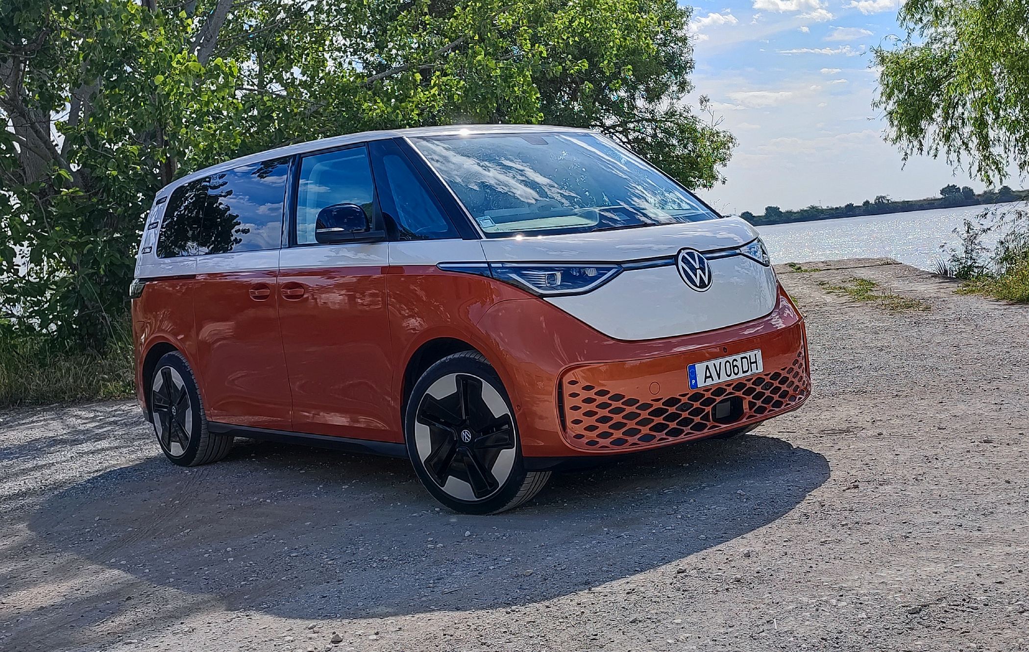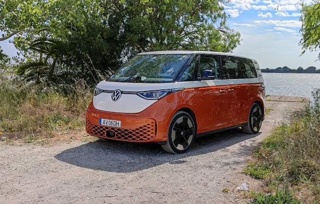 A iluminação LED à frente e atrás é um dos elementos mais facilmente destacados deste ID. Buzz, cujo design adota uma filosofia semelhante à de um monólito que é depois seccionado pela ampla superfície vidrada para uma luminosidade sem mácula no habitáculo. Num piscar de olho ao passado, o logótipo da Volkswagen na dianteira é maior do que noutros modelos. Sem grelhas amplas, apenas a secção inferior do para-choques dispõe de uma abertura pequena que é mascarada por um padrão quadriculado muito desportivo. Os faróis na versão ensaiada contavam com tecnologia opcional IQ.Light de matriz LED.