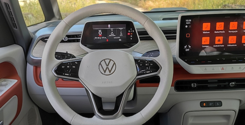 A direção carece de alguma habituação, não sendo particularmente informativa para o condutor. Por outro lado, o facto de dispor de motor traseiro e de direção ‘by wire’ elimina as vibrações neste elemento, ao mesmo tempo que a bateria colocada em posição central ajuda – e de que maneira! – a baixar o centro de gravidade com benefícios amplos para o dinamismo. O ID. Buzz é responsivo e até se aguenta a toadas mais desportivas em percursos sinuosos, superando as nossas expectativas.