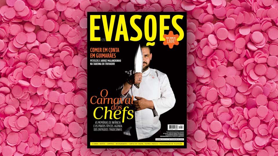 CAPA Memórias do Carnaval de cinco chefs portugueses e ainda um roteiro pelos Entrudos tradicionais. COMER E BEBER Comer em conta em Guimarães, a nova carta do Sauvage, em Lisboa, e um lugar de petiscos na Ribeira do Porto. PASSEAR Um hotel em Angra do Heroísmo que é um jardim junto ao mar. Chef Óscar Geadas faz a capa do novo número da Evasões.