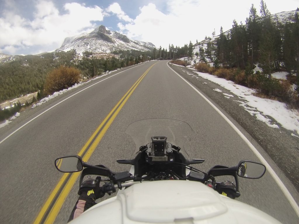 Nos primeiros trinta quilómetros não vi qualquer outra moto em ambos os sentidos o que podia pronunciar mau tempo mas, felizmente, embora lá em cima houvesse neve nas bermas da estrada, a temperatura nunca baixou dos 6º. Assim, pude atravessar o parque, que é uma beleza. Sequoias com várias dezenas de metros ladeiam a estrada e cobrem algumas das montanhas desta Serra Nevada, como lhe chamam. Outras são enormes rochas nuas com água a cair dessas elevações em pequenas cascatas que atravessam a estrada e vão alimentar riachos e lagos. Uma maravilha.