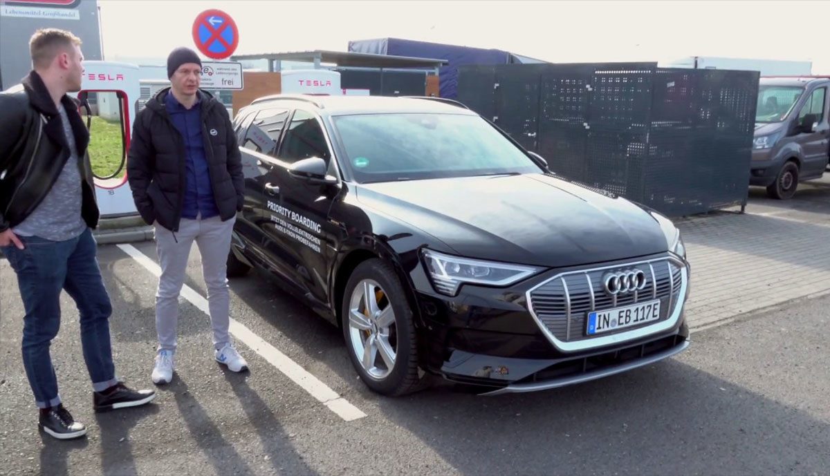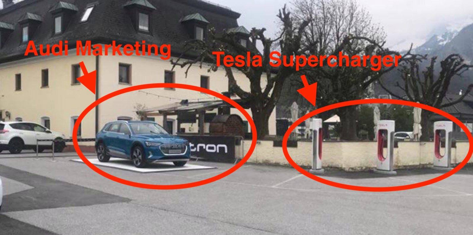 Vários exemplares do Audi e-Tron foram fotografados em locais onde a Tesla tem instalados os seus módulos de supercarregadores. Em algumas dessas estações são mesmo visíveis painéis com publicidade do concorrente de Ingolstadt.