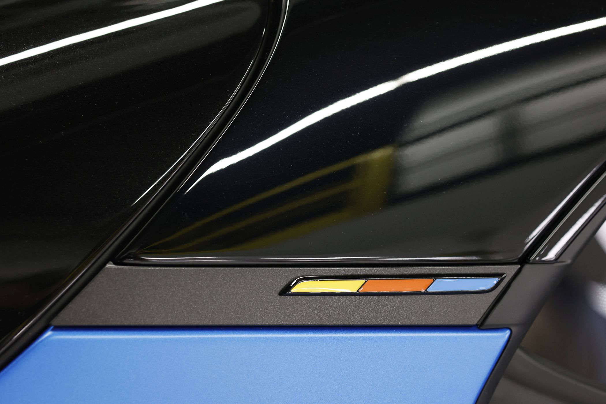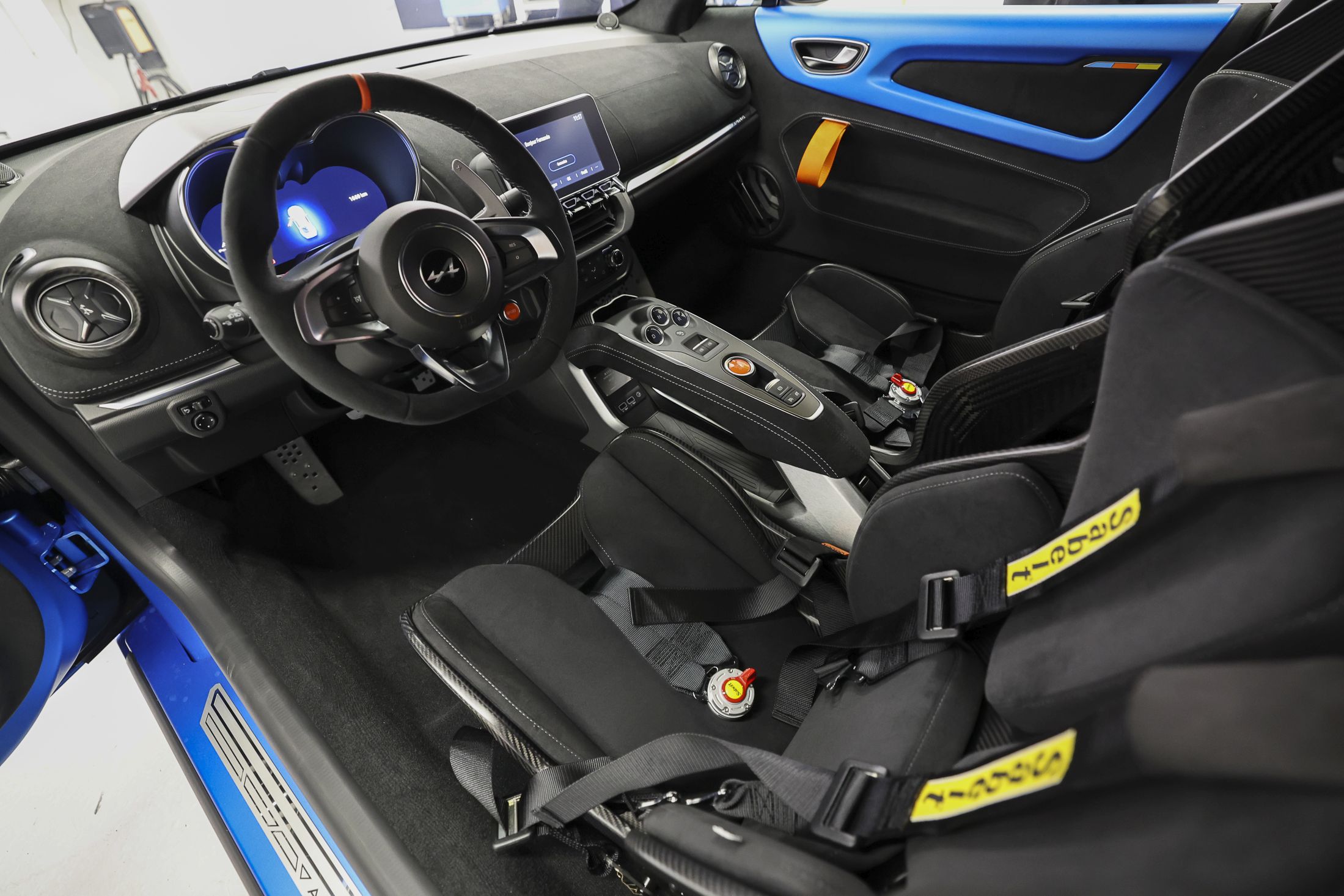 Passando para o interior, o A110 R Fernando Alonso aposta nas cores do piloto, com o laranja a ter destaque nas pegas das portas (cintas de tecido) e no centro do volante, contrastando com o resto do habitáculo em microfibra. Também aqui é possível encontrar a assinatura do piloto e a bandeira azul, laranja e amarela nos painéis das portas.