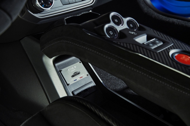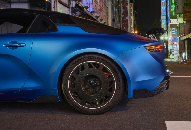 Na dianteira, há também um pequeno ‘lábio’ em fibra de carbono, como no A110 S, mas as entradas de ar foram integradas junto ao símbolo na parte superior, reduzindo assim a resistência ao ar e melhorando o efeito descendente no eixo dianteiro. O capot é também produzido em fibra de carbono, traduzindo-se numa redução de 2,9 kg face ao componente em comparação presente nos demais modelos da Alpine.O difusor traseiro foi redesenhado para um visual mais exclusivo, sendo composto por um misto de fibra de carbono e fibra de vidro, com um baixo peso geral. Mais largo e mais saliente, oferece um visual bem mais agressivo à traseira, com elementos como as pequenas asas laterais a reduzirem a a turbulência aerodinâmica. As próprias saias laterais mais destacadas também são compostas em carbono e mostram até uma mensagem ‘Proibido pisar’. A adição de suportes na suspensão traseira permitem também aumentar a eficácia do difusor e do fundo plano praticamente coberto no seu total.