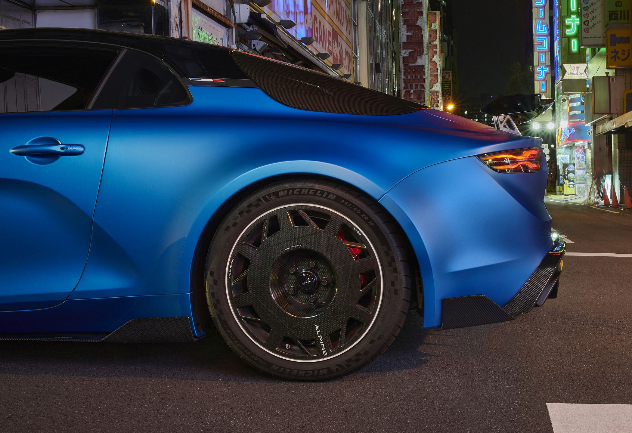 Na dianteira, há também um pequeno ‘lábio’ em fibra de carbono, como no A110 S, mas as entradas de ar foram integradas junto ao símbolo na parte superior, reduzindo assim a resistência ao ar e melhorando o efeito descendente no eixo dianteiro. O capot é também produzido em fibra de carbono, traduzindo-se numa redução de 2,9 kg face ao componente em comparação presente nos demais modelos da Alpine.