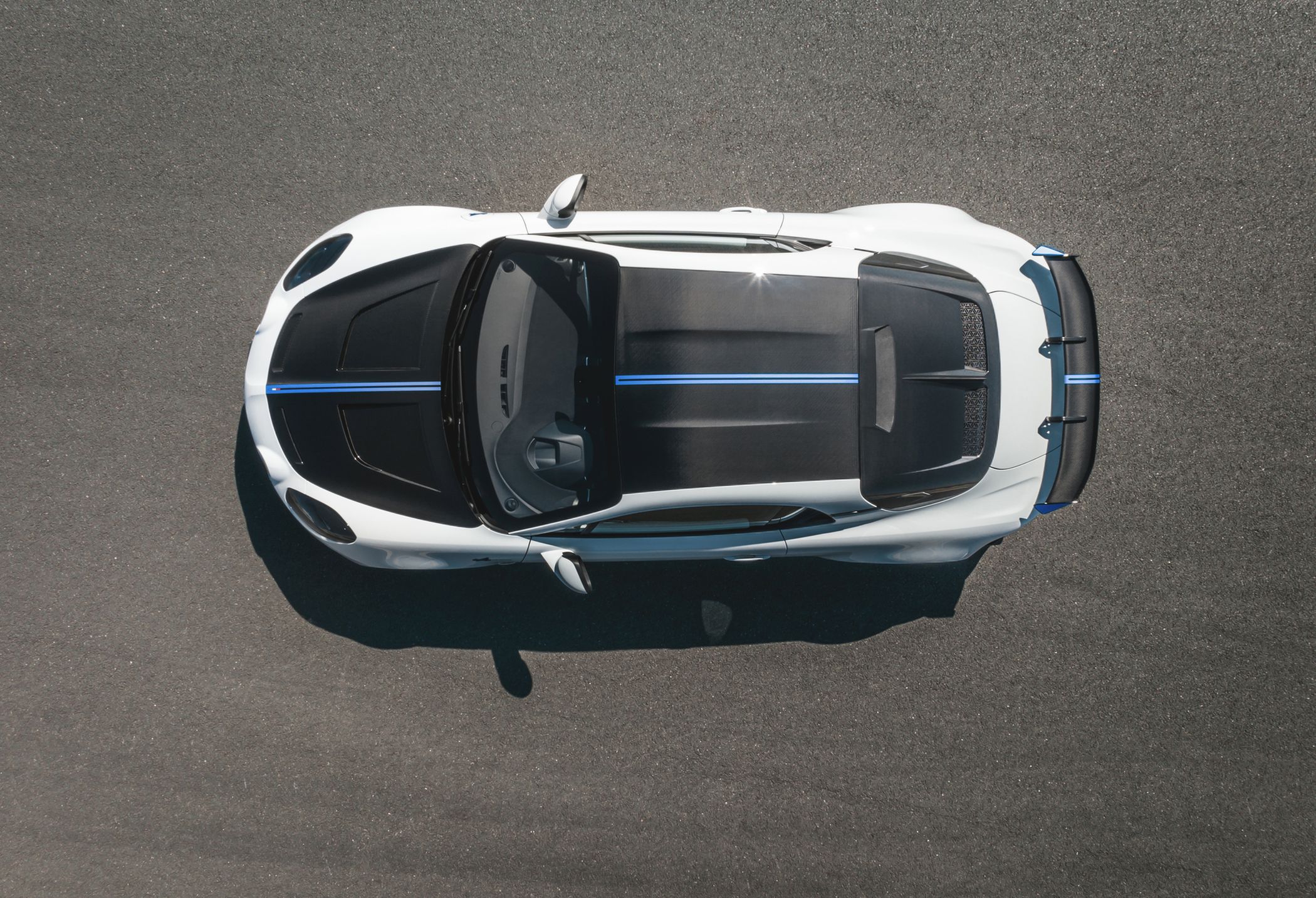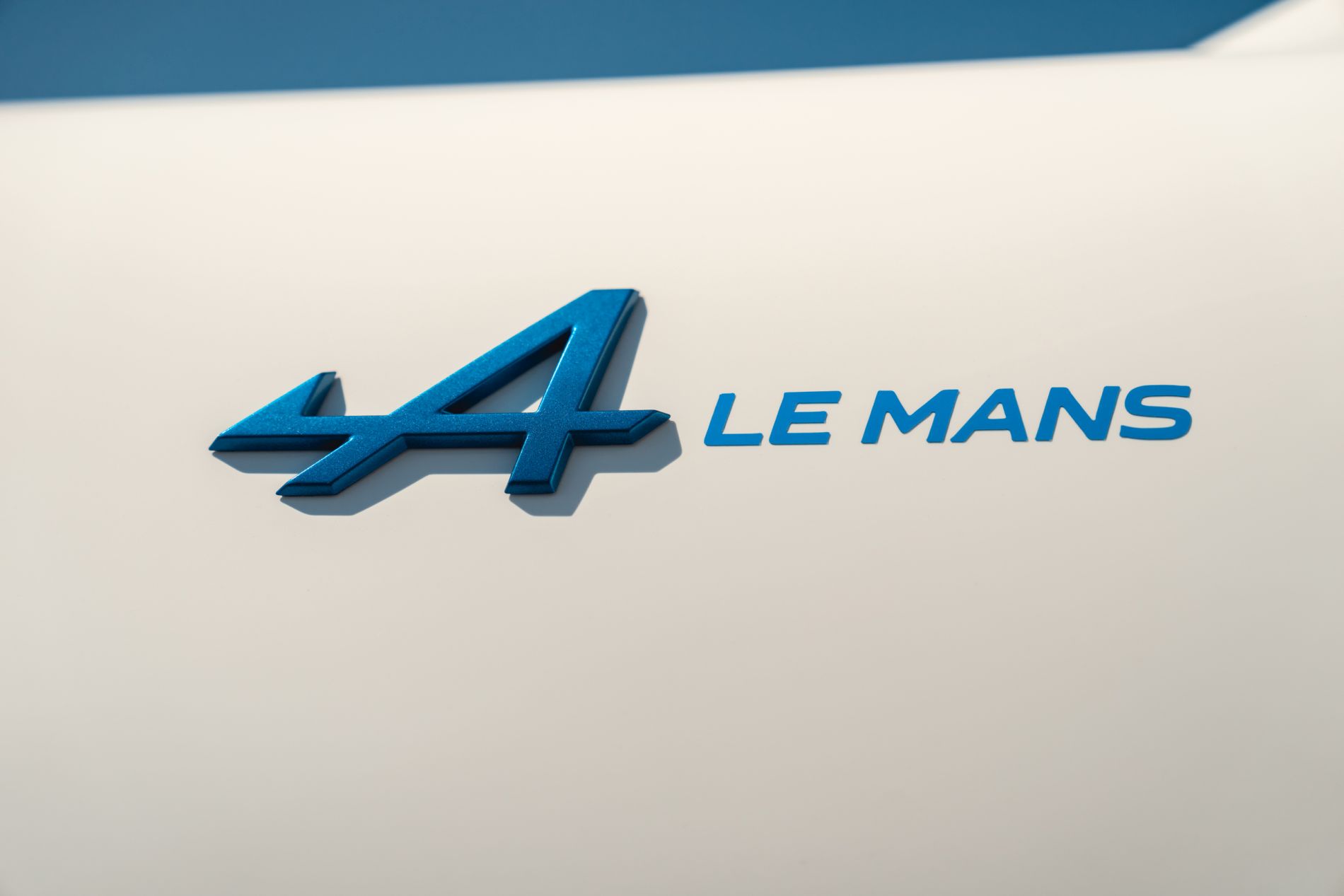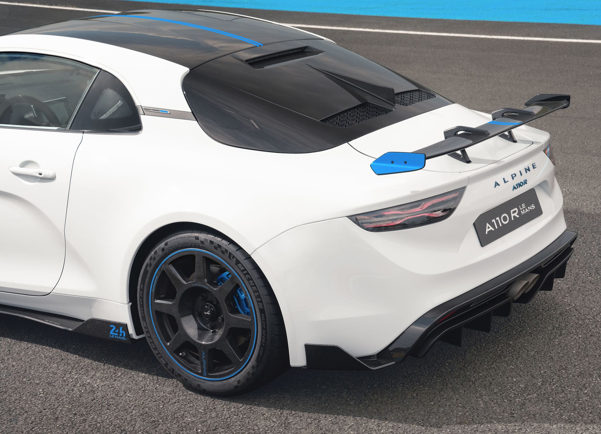 Adicionalmente, o A110 R Le Mans distingue-se pela exclusiva pintura 24H de Le Mans em tons de branco e azul. Uma fina linha dupla de azul é aplicada no capot dianteiro, no tejadilho e no spoiler traseiro, numa referência à competição, complementada pelas aletas azuis do spoiler traseiro. Um rebordo azul distingue as jantes em carbono, que são abertas na traseira para uma resistência de travagem ainda maior, enquanto a barbatana (vertical) de tubarão adicionada ao óculo traseiro, em carbono, é uma referência ao A480 que competiu nas 24 Horas de Le Mans.Esta emblemática série limitada apresenta a assinatura oficial das 24 Horas de Le Mans nos guarda-lamas dianteiros, nas soleiras laterais e nos apoios de cabeça em microfibra dos bancos baquet Sabelt Track. Como toque final, o traçado do circuito das 24 Horas é subtilmente gravado a laser na pala de sol. Por fim, o A110 R Le Mans ostenta uma placa numerada da fábrica de Dieppe, com a assinatura oficial “24H Le Mans”, para distinguir os 100 exemplares desta icónica versão do A110 R.