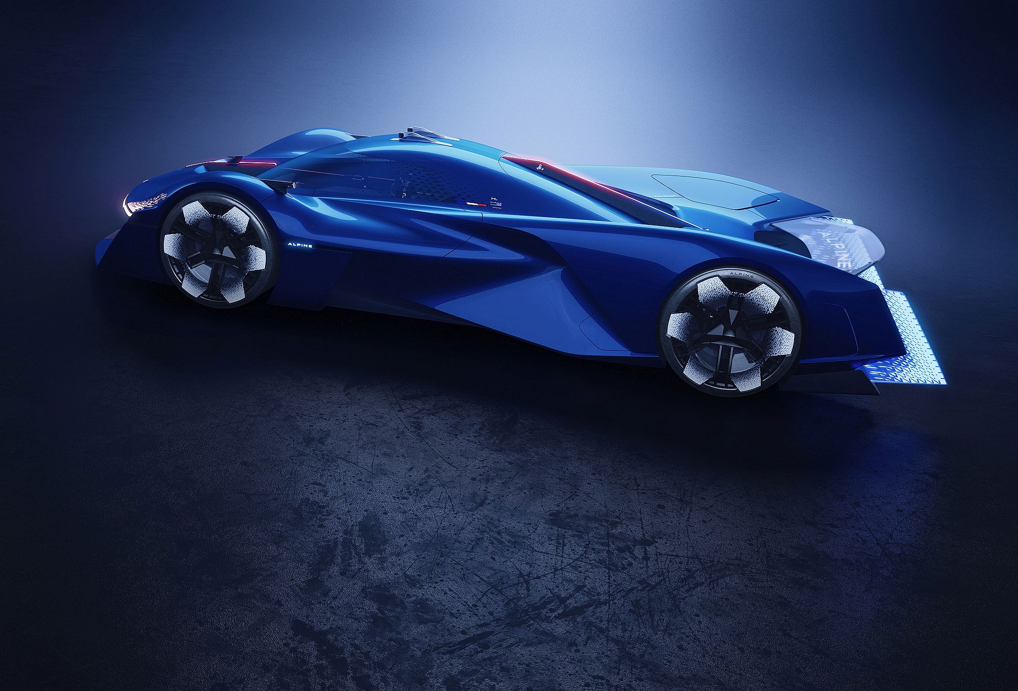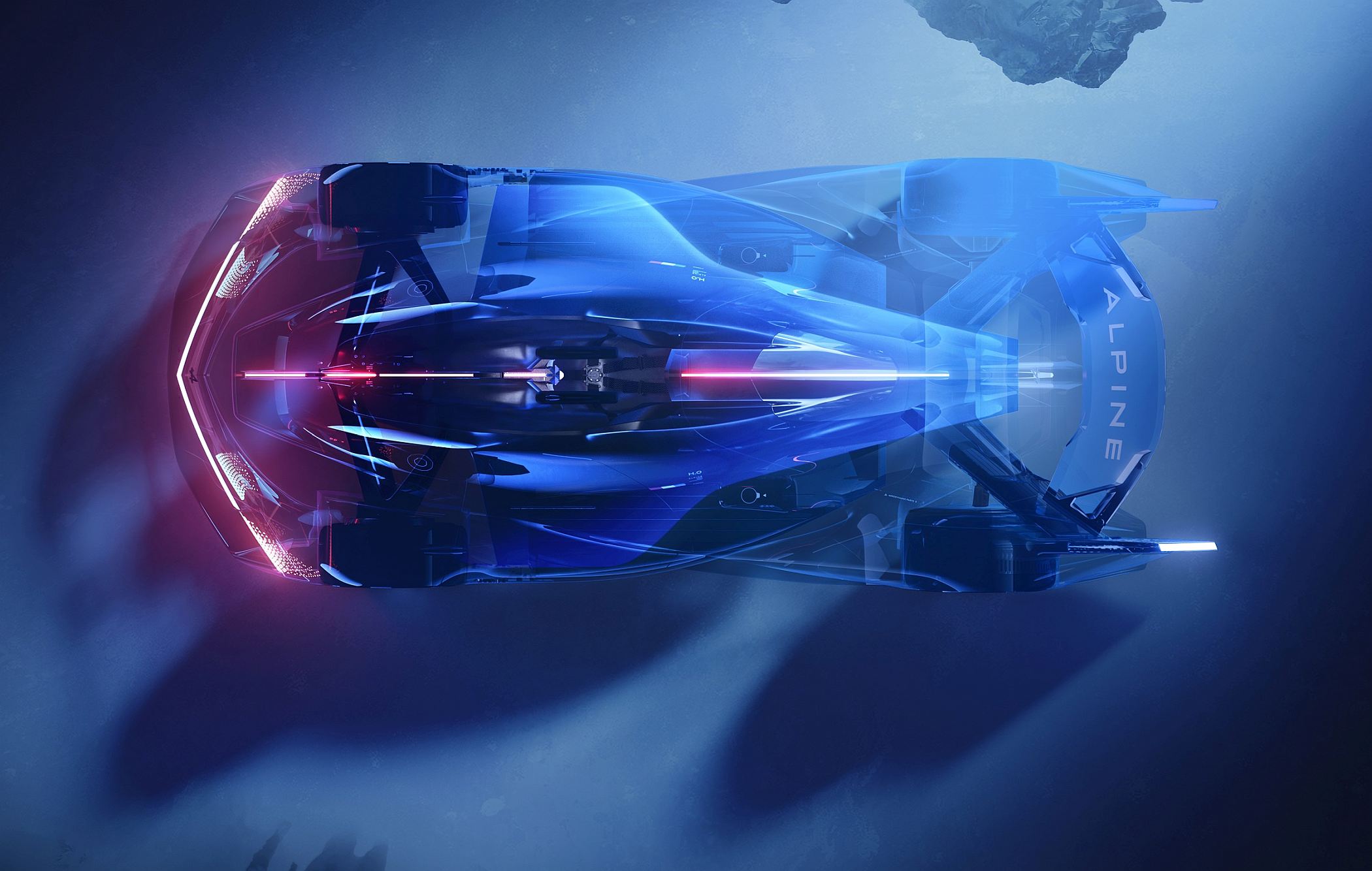 As assinaturas de luz do Alpenglow revelam uma nova identidade para os automóveis da Alpine no futuro. O fluxo de luz começa na frente, onde é vermelho, seguindo depois até à traseira, onde adota várias tonalidades de azul, apontando para o seu motor de combustão interna de hidrogénio, que não liberta praticamente nada mais do que vapor de água.