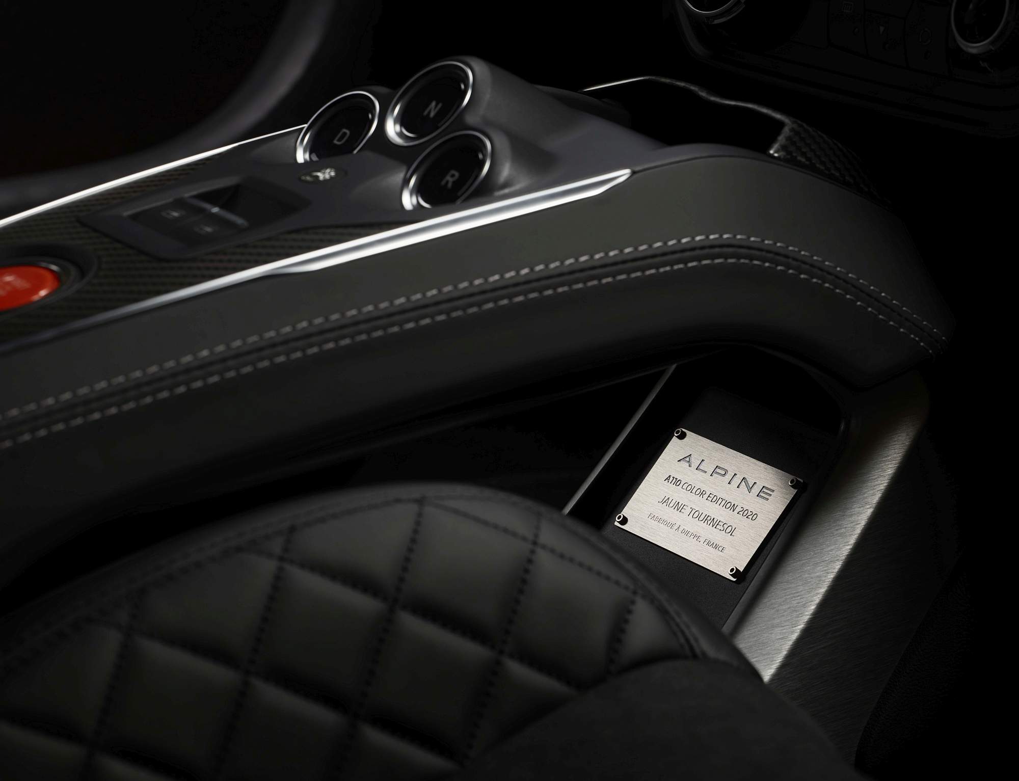 Na carroçaria, muitos dos elementos são contrastantes em cor preta, incluindo as jantes de 18 polegadas GT Race ou as máscaras dos faróis dianteiros. As pinças dos discos de travão surgem pintadas em antracite. O tejadilho pode ser concebido em fibra de carbono para maior ligeireza e para um maior contraste. Já os emblemas tricolores no interior são substituídos no A110 Color Edition 2020 por emblemas em amarelo e fibra de carbono. Também há uma placa central identificativa da sua exclusividade.