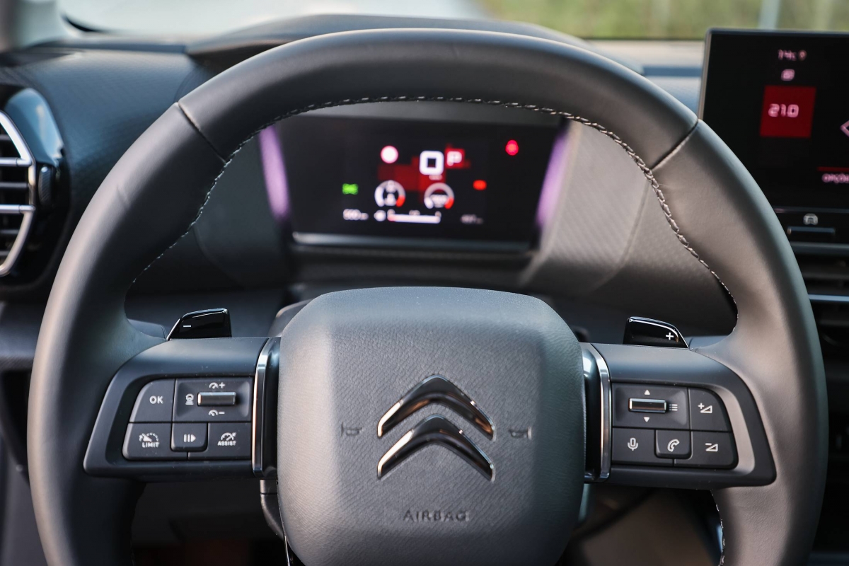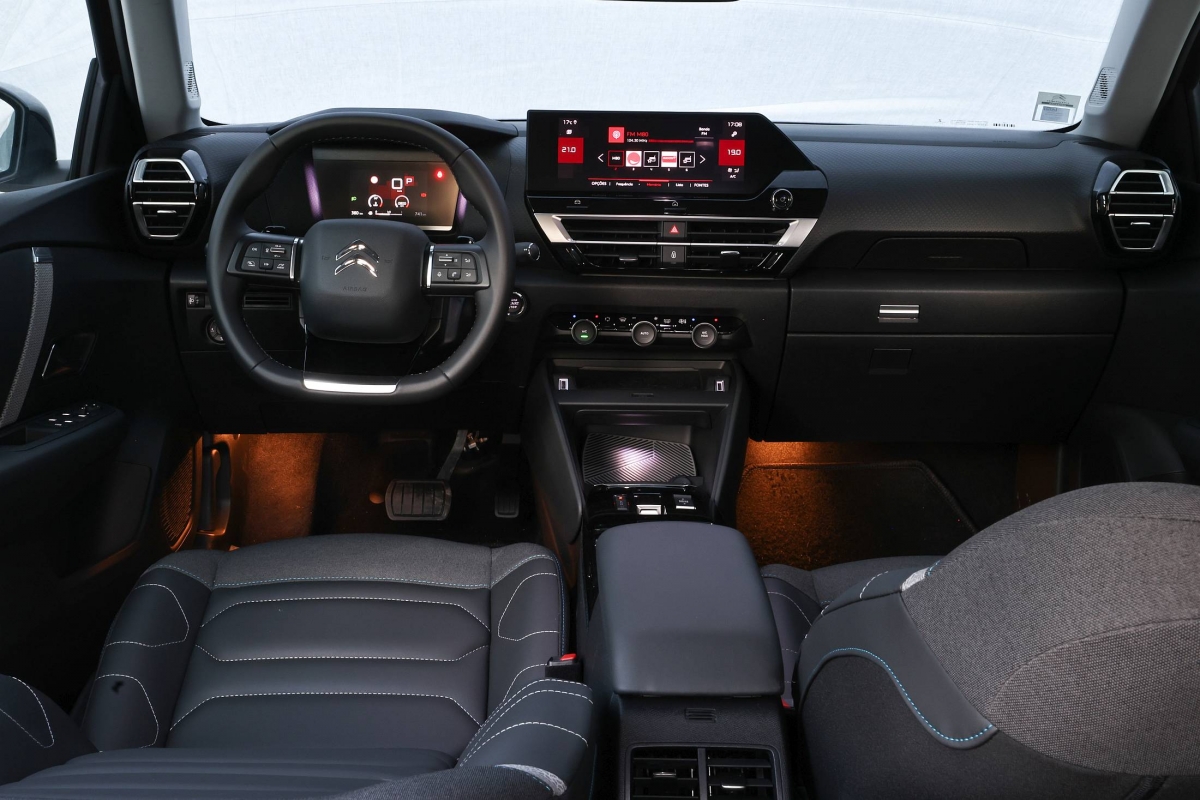 A ergonomia é beneficiada com a posição de condução (como já atrás se indicou, elevada e com boa visibilidade), não havendo sequer grande obstrução visual para trás por causa do spoiler que divide o óculo traseiro – uma ideia que parece ter sido inspirada no rival Honda Civic. Os comandos estão bem definidos e têm fácil acesso, como o ecrã tátil de 10″, que concentra as principais funções do infoentretenimento, mas não as do ar condicionado (bem-haja à Citroën), que têm comandos separados e físicos pouco abaixo do ecrã. Também há a destacar a opção pelo comando físico do volume do áudio. A instrumentação, embora digital, tem um ecrã de reduzidas dimensões e algo subaproveitado – pelo menos, comparativamente ao que se encontra nos ‘primos’ da Peugeot, com os seus i-Cockpit. Compensa pelo facto de ter um sistema head-up display.