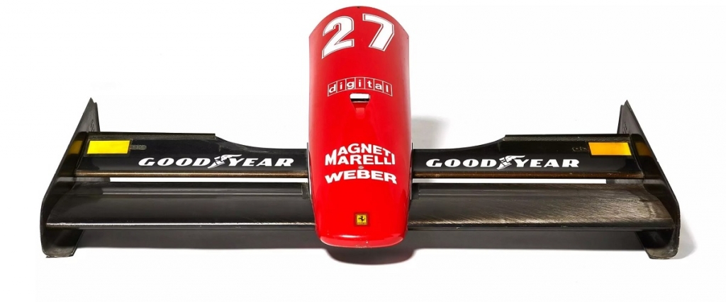 As asas frontais, também conhecidas como narizes, são desenvolvidas de modo a ser fácil a sua troca durante a corrida sendo, por isso, necessário ter várias prontas a aplicar em cada Grande Prémio. O mesmo acontece com a asa traseira, apesar de esta não estar sujeita a tantos danos. Ambas são produzidas em fibra de carbono, para manter o peso baixo. As asas que se veem no artigo foram adquiridas a um antigo mecânico da Scuderia Ferrari e mantêm todos os patrocinadores da época.