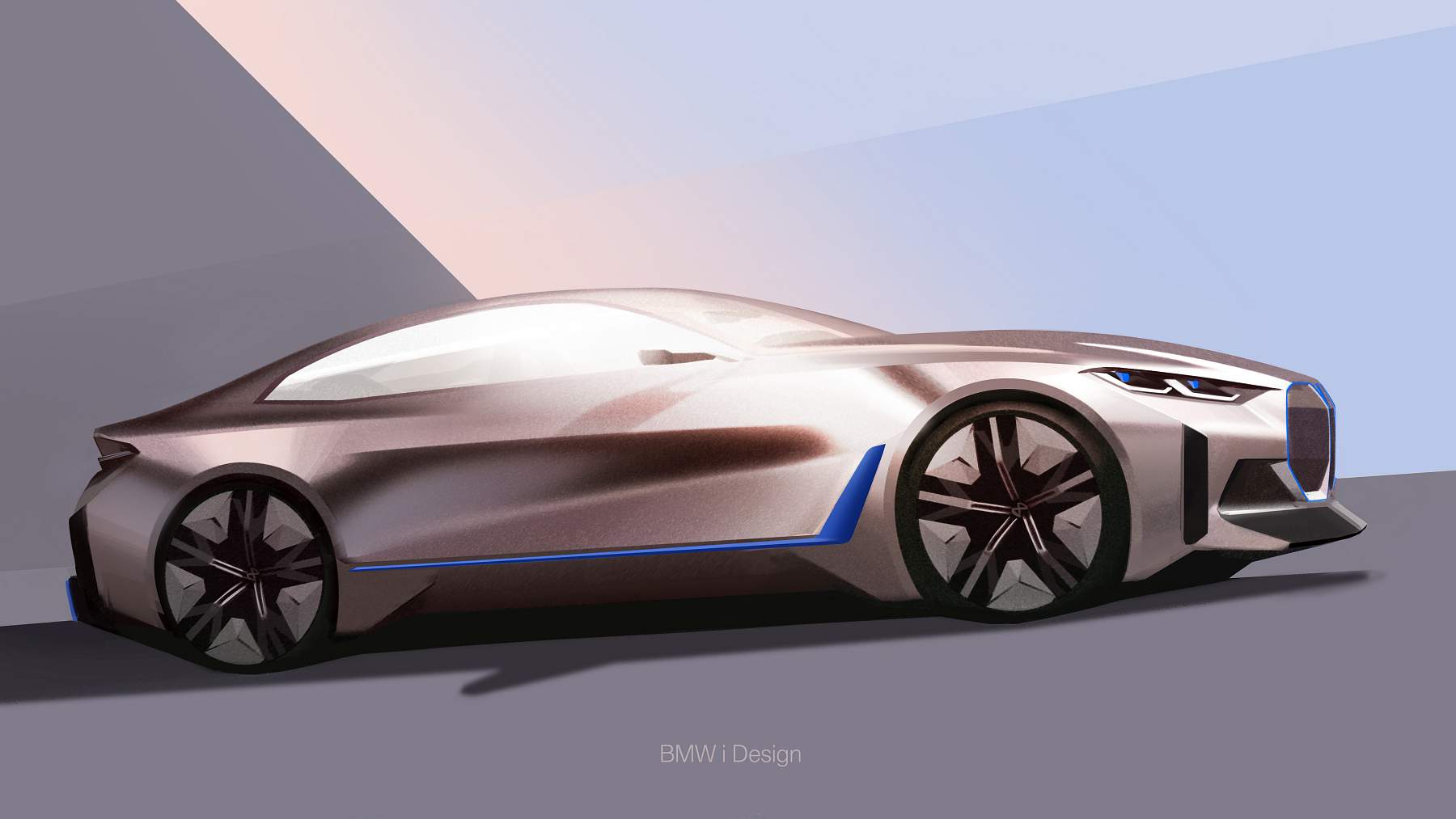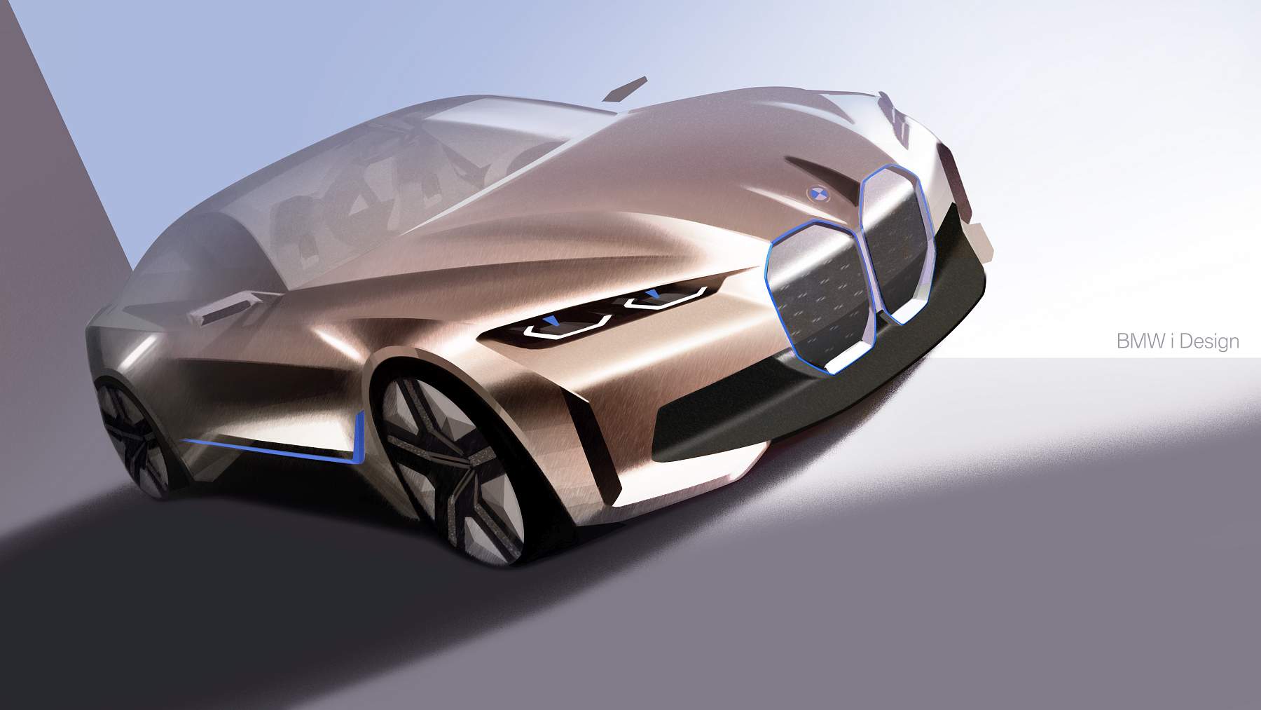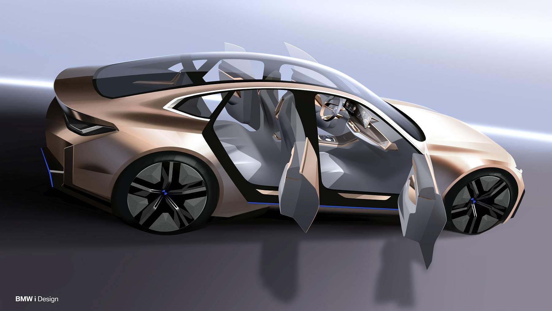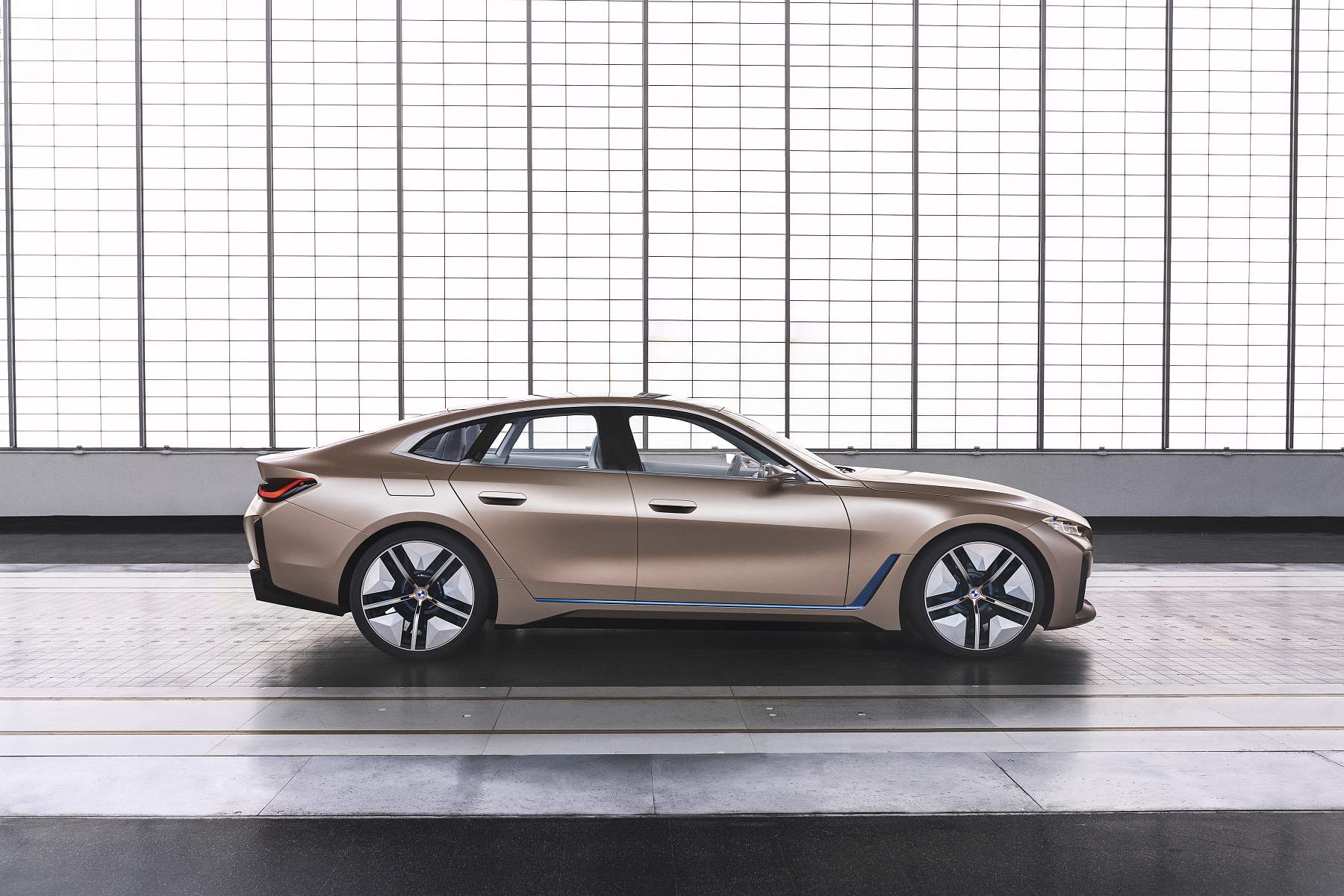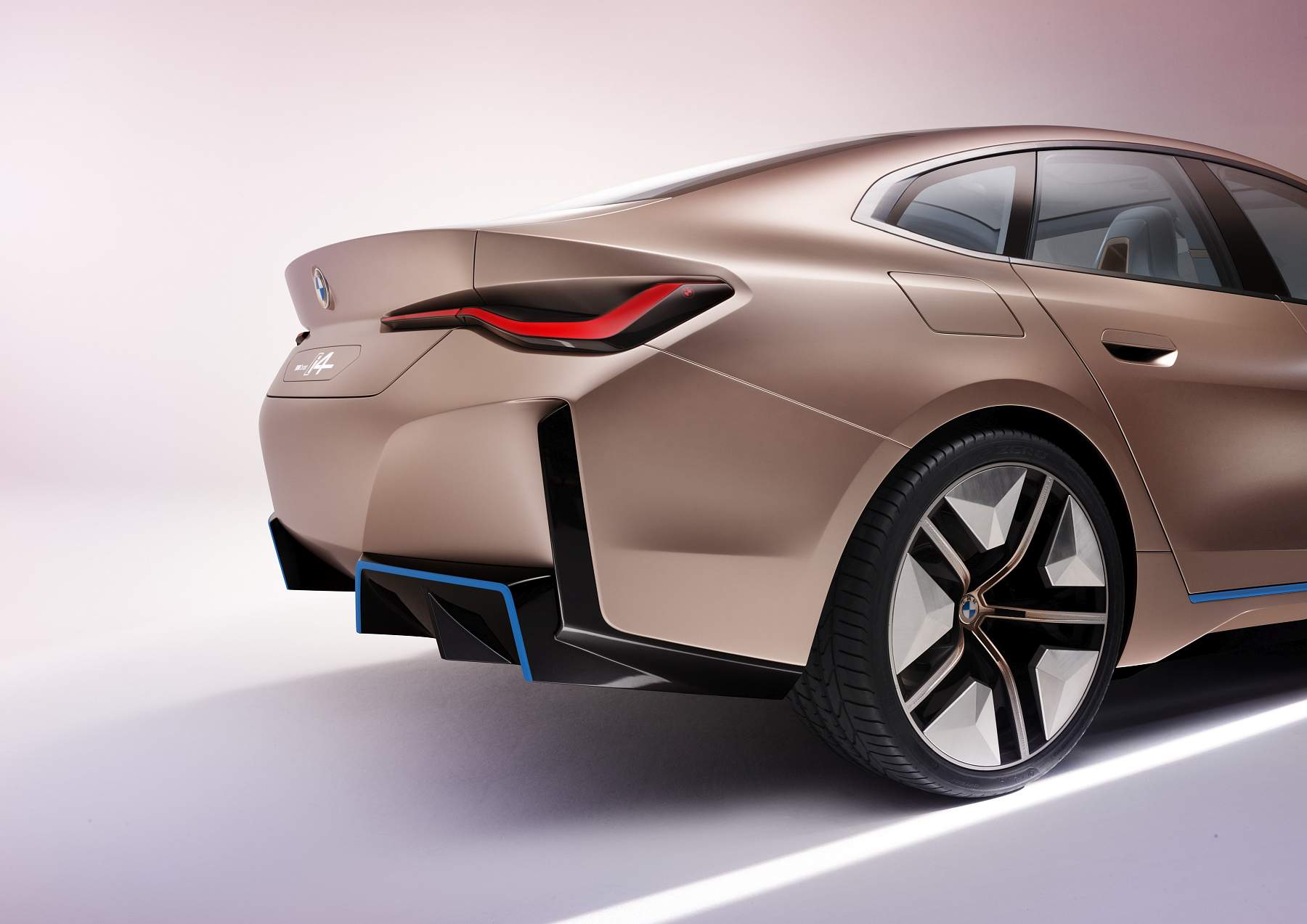 Além do desenho esguio com muito cuidado aerodinâmico, o Gran Coupé elétrico da marca alemã exibe proporções compactas mas distância entre eixos alongada, assim oferecendo muito espaço a bordo num perfil desportivo e funcional que as quatro portas possibilitam. A pintura exterior acobreado Frozen Light Copper recupera uma tonalidade já apresentada no Vision iNEXT, mostrando um jogo de cores original.