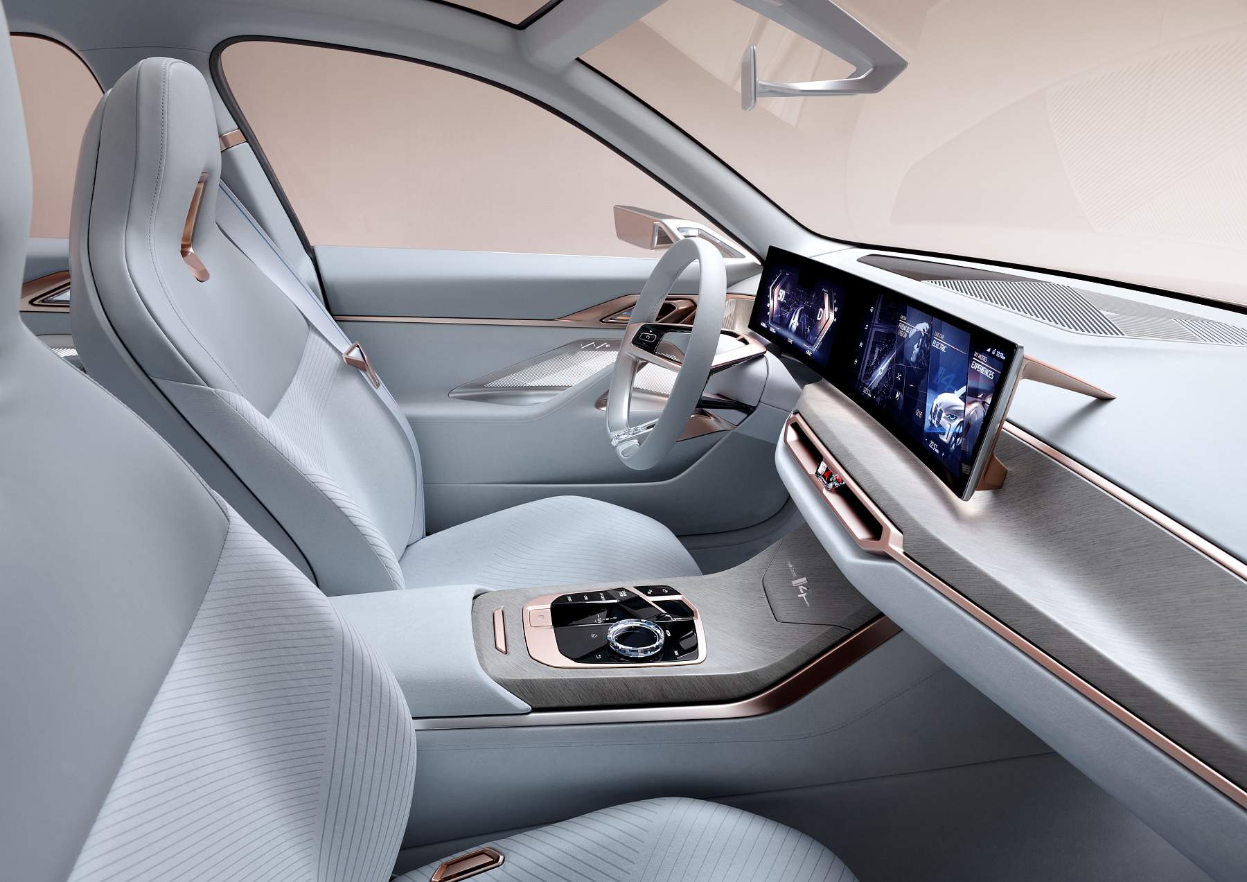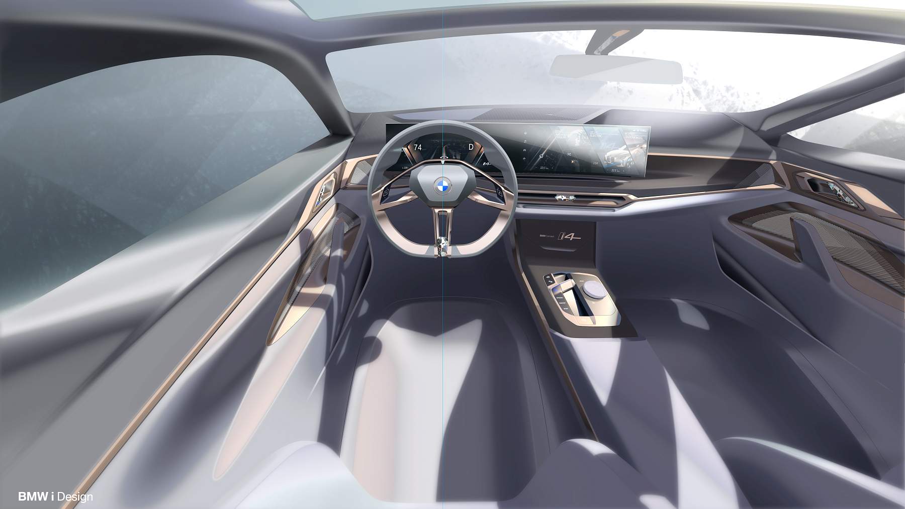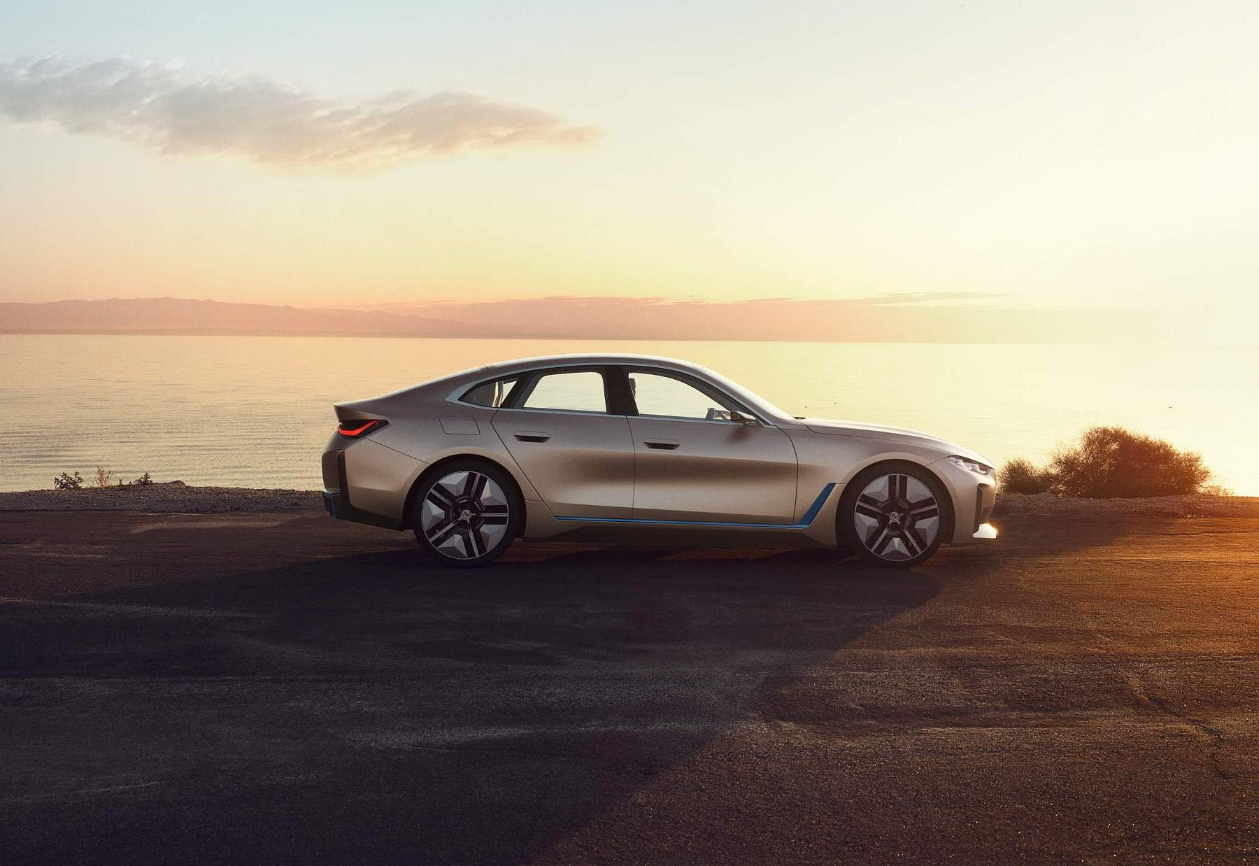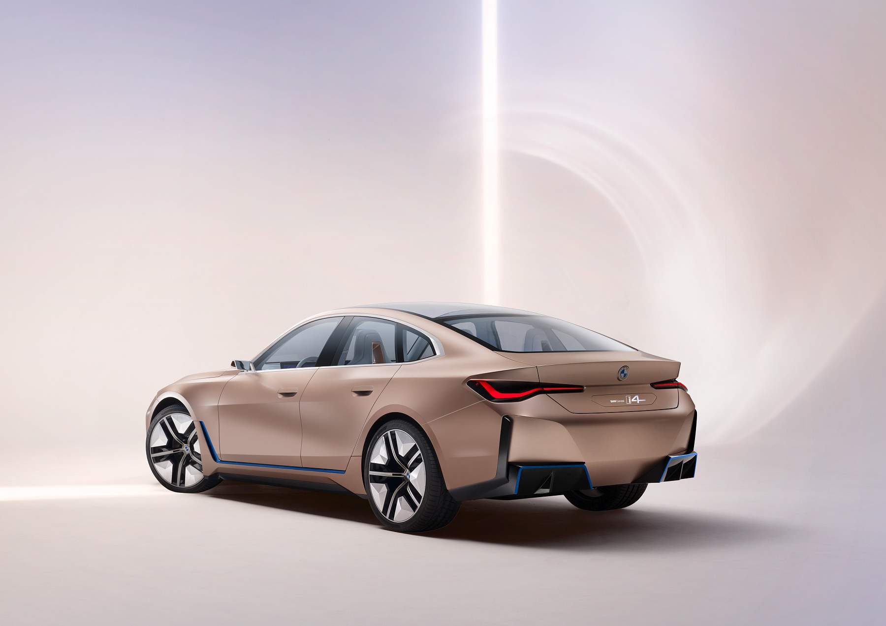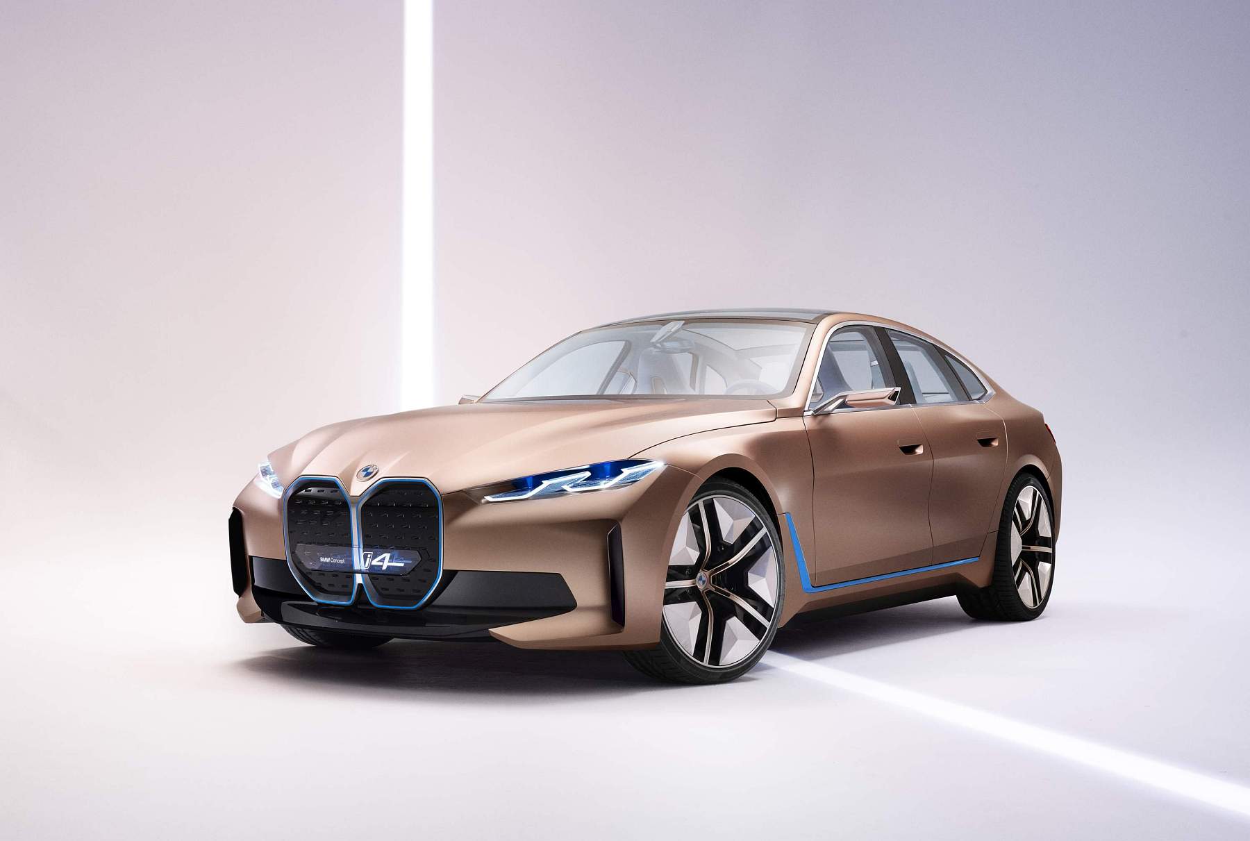 Além do desenho esguio com muito cuidado aerodinâmico, o Gran Coupé elétrico da marca alemã exibe proporções compactas mas distância entre eixos alongada, assim oferecendo muito espaço a bordo num perfil desportivo e funcional que as quatro portas possibilitam. A pintura exterior acobreado Frozen Light Copper recupera uma tonalidade já apresentada no Vision iNEXT, mostrando um jogo de cores original.