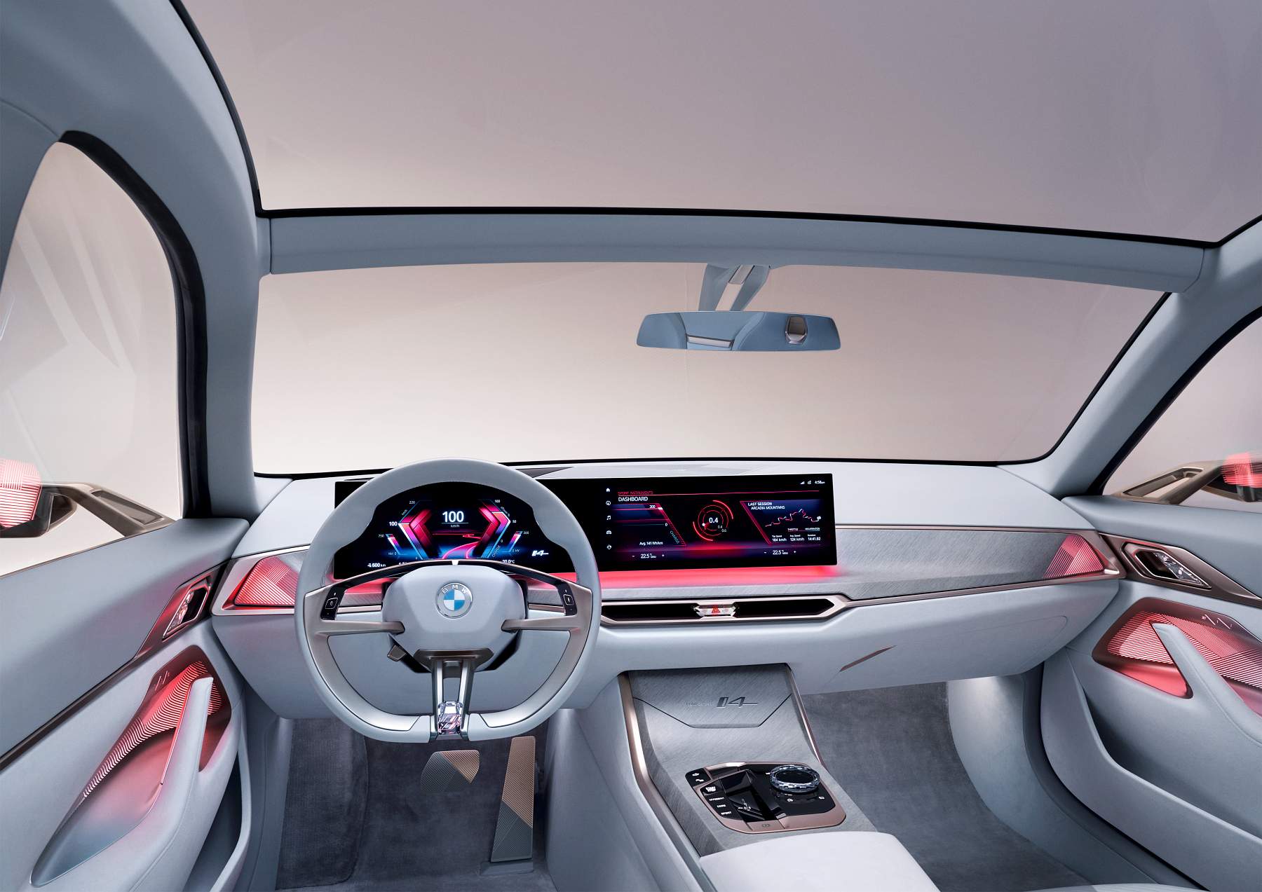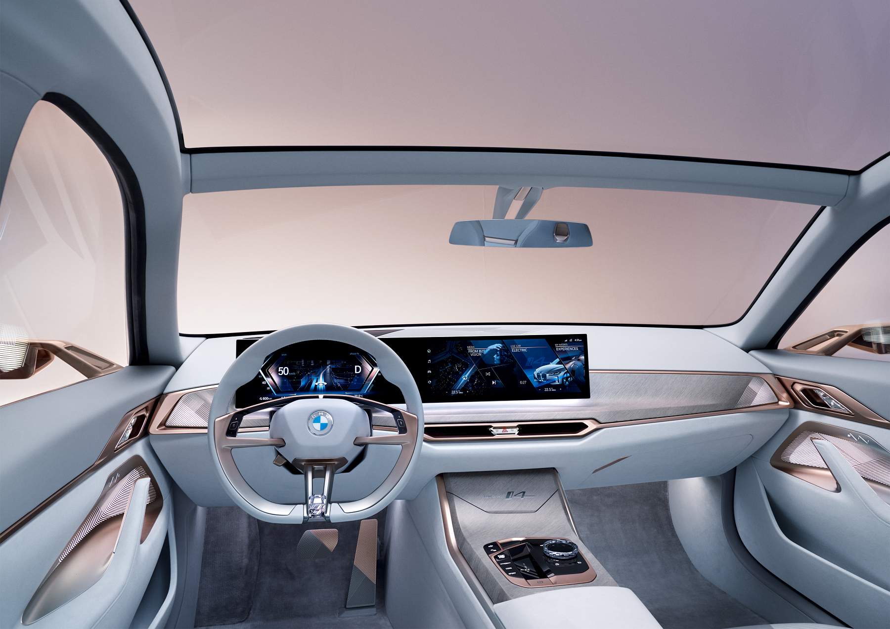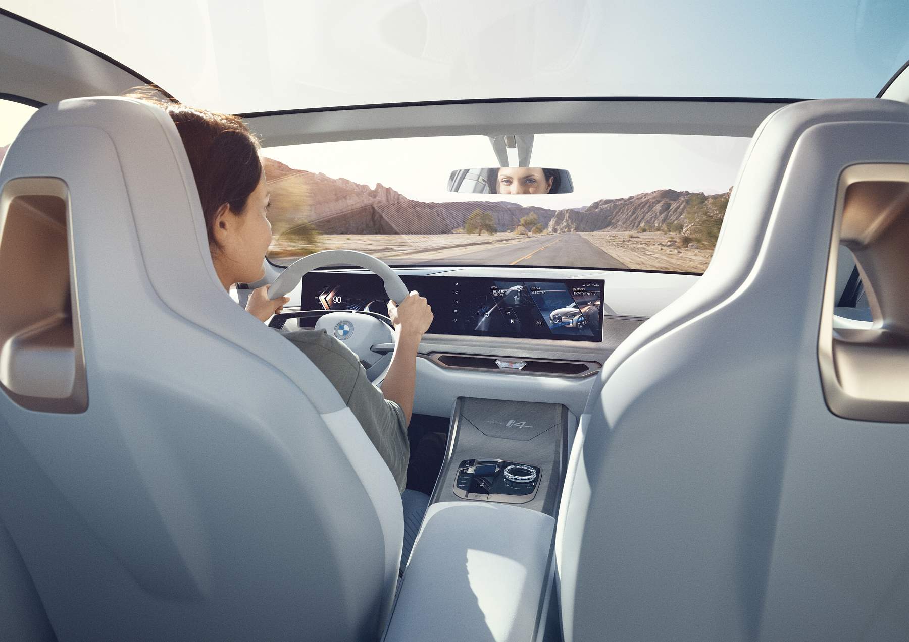 Interior é visão do futuro próximoA bordo, o interior centra-se no condutor para os momentos em que este quiser assumir o comando do veículo. Assim, cada elementos do habitáculo está orientado no seu sentido. O ecrã curvo atrás do volante revela uma nova abordagem à apresentação das informações de condução, mostrando um pouco do que serão as versões de produção do iNEXT e do i4. O BMW Curved Display estende-se até ao painel central para uma aparência muito moderna. Quase todas as funcionalidades do veículo estão integradas no ecrã central, incluindo a climatização.