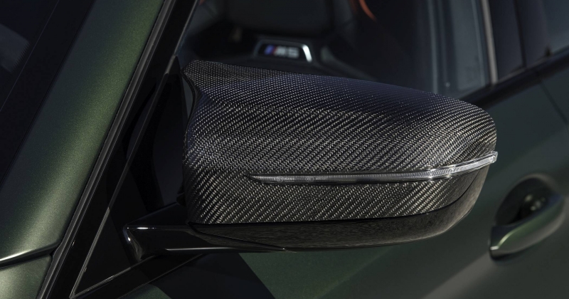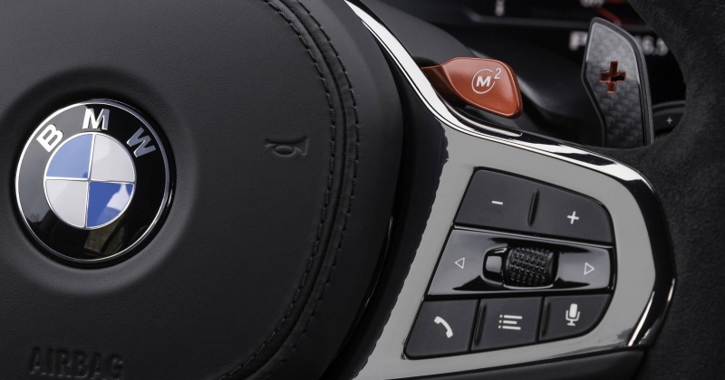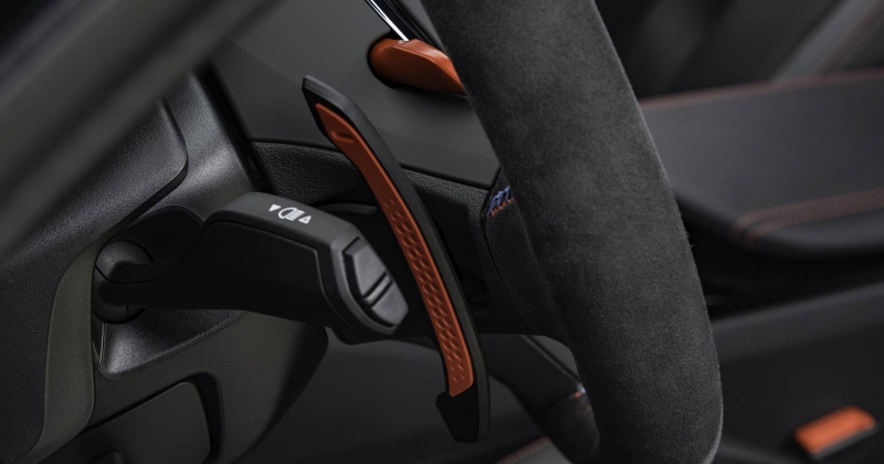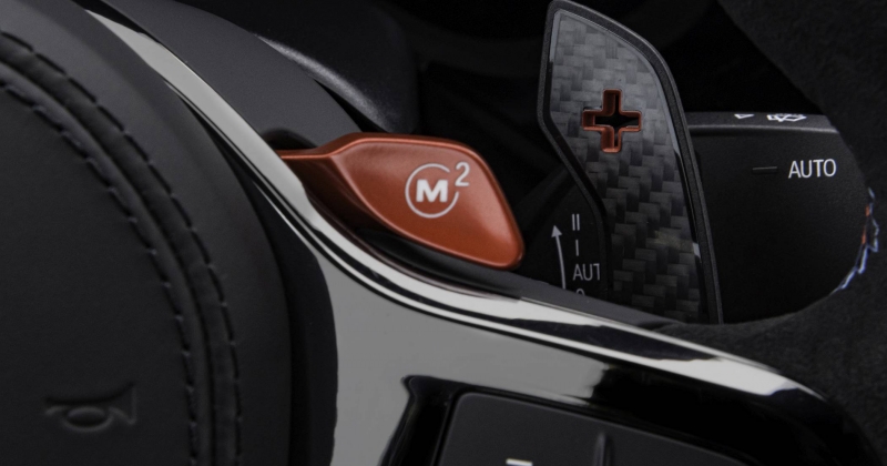 O volante desportivo M Alcantara conta com um marcador de centro perfurado a encarnado para um toque identificativo mais aproximado ao de um carro de competição, reforçado pelas patilhas atrás do volante em fibra de carbono. Uma cobertura fixa de baixo peso na consola central substitui o habitual encosto de braço com tampa para arrumação, apostando uma vez mais no couro Merino com pespontos duplos em vermelho. A cor é usada, novamente, na designação ‘CS’ presente no painel de instrumentos e entre os dois bancos atrás.