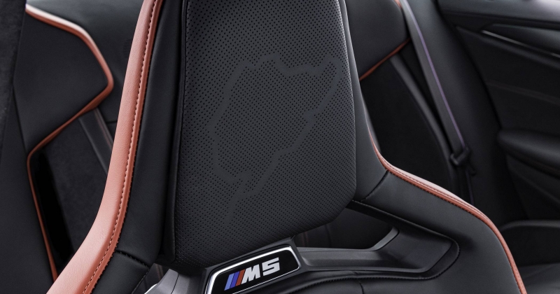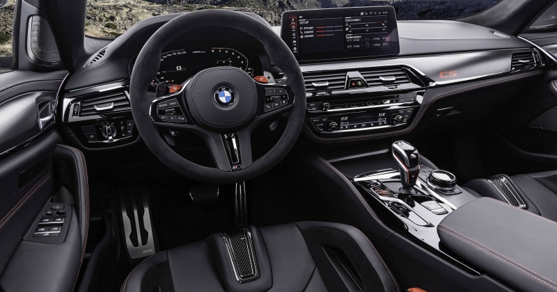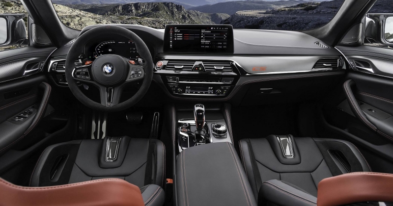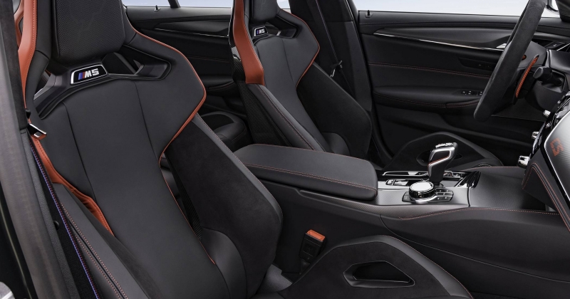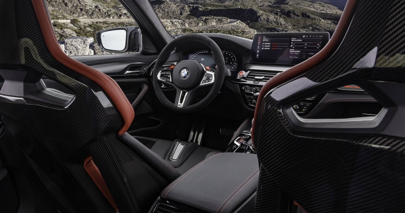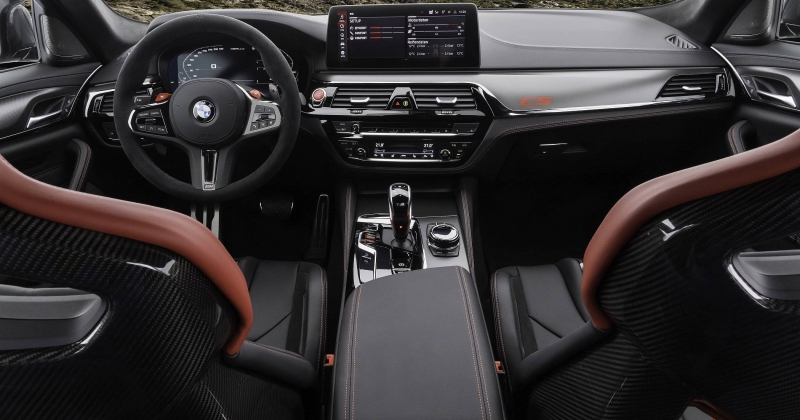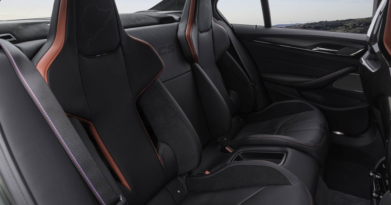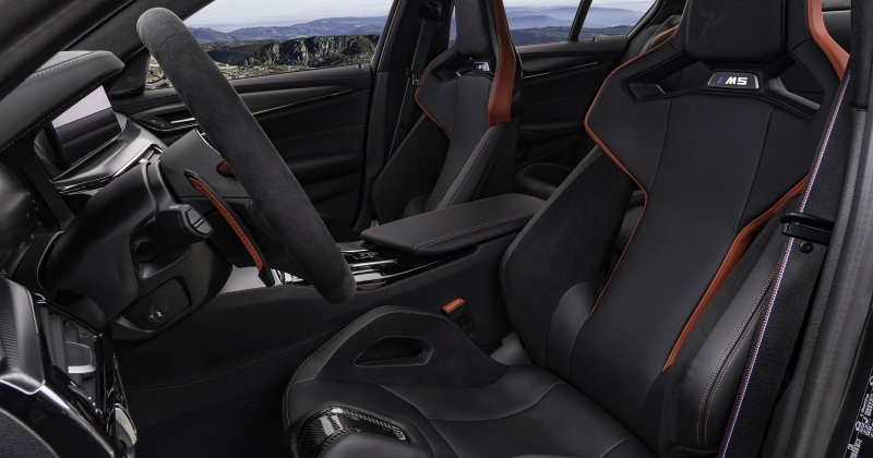 A experiência de condução e de vivência a bordo é reforçada pela adoção de novos bancos, com os dois da frente a terem a sua composição em fibra de carbono (M Carbon), havendo também dois bancos individuais atrás, muito ao estilo de bacquets. Em ambos os casos, há revestimento em couro, com pespontos contrastantes em vermelho Mugello Red. Os encostos de cabeça integrais nos bancos demarcam-se pelo desenho do circuito alemão de Nürburgring Nordschleife, no qual o M5 CS também foi desenvolvido.
