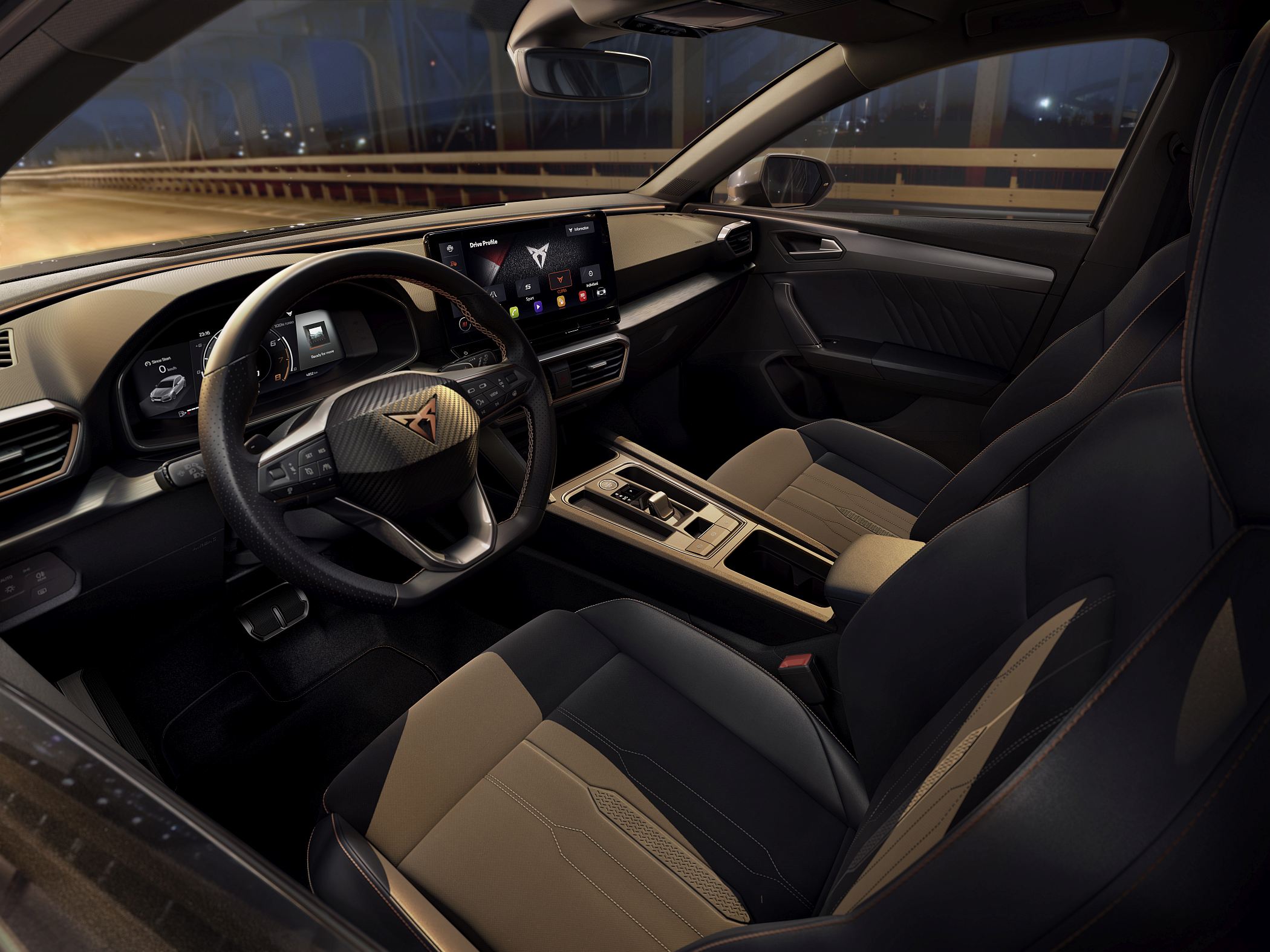 No interior, destaque para os bancos desportivos CUPRA em tecido ou, como opção, para os bancos tipo Bacquet, em pele, complementados pelo tablier costurado, todos na cor ‘Petrol Blue’ ou preto.