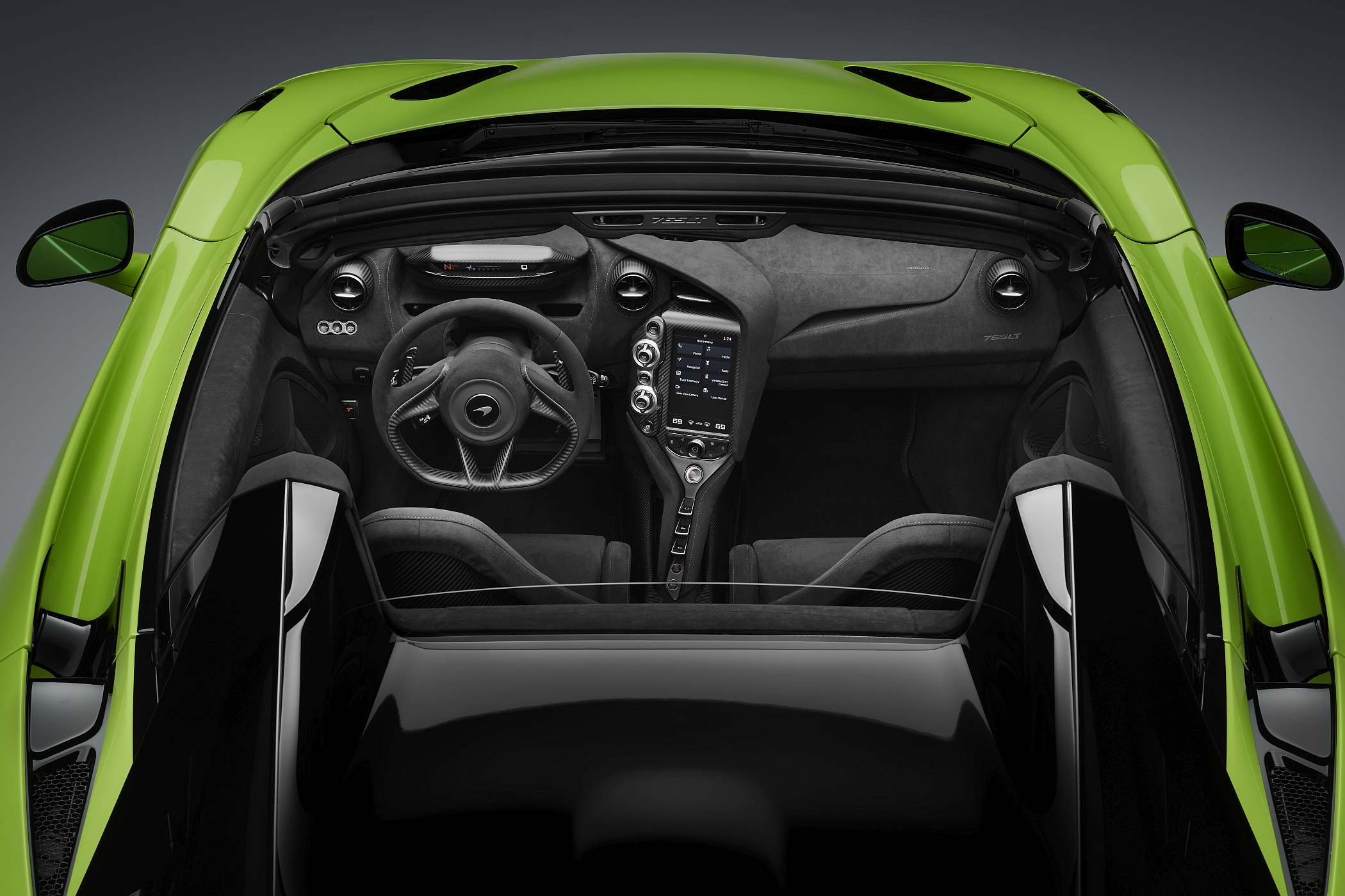 O tejadilho é composto por um tejadilho rígido retrátil com uma peça única em fibra de carbono que pode abrir-se em apenas 11 segundos e a velocidades até aos 50 km/h, beneficiando de elementos estruturais como a MonoCage II-S, em fibra de carbono, que serve de elemento central para a totalidade do 765LT Spider. Tal é a resistência estrutural daquela estrutura que a McLaren não precisou de efetuar quaisquer reforços em relação ao coupé, o que permitiu também manter o peso do conjunto sobre controlo. Na traseira deste desportivo, suportes estruturais igualmente em fibra de carbono estão soldados ao chassis para maior proteção em caso de capotamento.