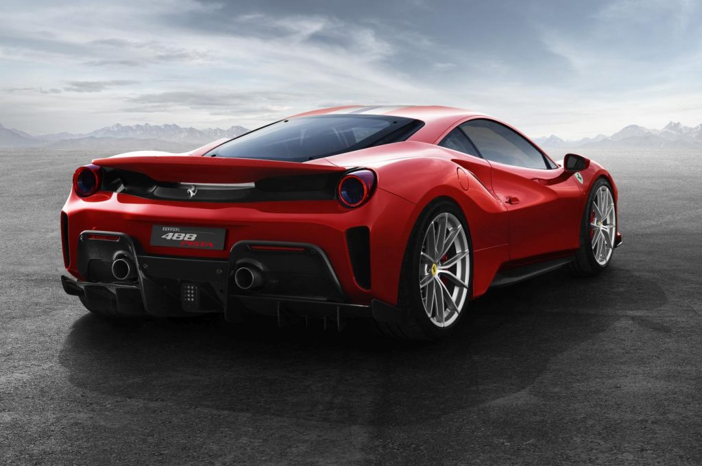 O spoiler superior representa um aumento da carga aerodinâmica na ordem dos 25% face ao 488 GTB de base, ao passo que o difusor traseiro – bastante trabalhado e também inspirado na competição – permite um aumento de 12% na carga aerodinâmica, tornando o carro mais estável e ‘agarrado’ ao asfalto a velocidades mais altas. As aletas do difusor traseiro têm acionamento automático, rodando em até 14 graus na configuração de menos resistência ao ar para assim melhorar a eficácia do fluxo de ar.
