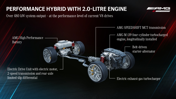 O conceito ‘E-Performance’ procura colocar a eletrificação ao serviço da desportividade, embora permita opções como a condução em modo elétrico e carregamentos externos em wallboxes ou tomadas públicas. Nesse sentido, o conceito modular permite que um motor elétrico seja associado a motores térmicos de oito ou de quatro cilindros, alimentado por uma bateria de alta performance desenvolvida em Affalterbach e sistema de tração variável 4MATIC+. O motor elétrico, dependendo da gama, pode ter até 150 kW e 320 Nm, e estará posicionado no eixo traseiro, sendo integrado com uma transmissão de duas velocidades controlada eletricamente e um diferencial autoblocante eletrónico numa unidade de controlo compacta (EDU). A bateria está igualmente no eixo traseiro, com uma capacidade de 6.1 kWh e 89 kg de peso. Com uma potência contínua de 70 kW, pode atingir um máximo de 150 kW por um período máximo de dez segundos.