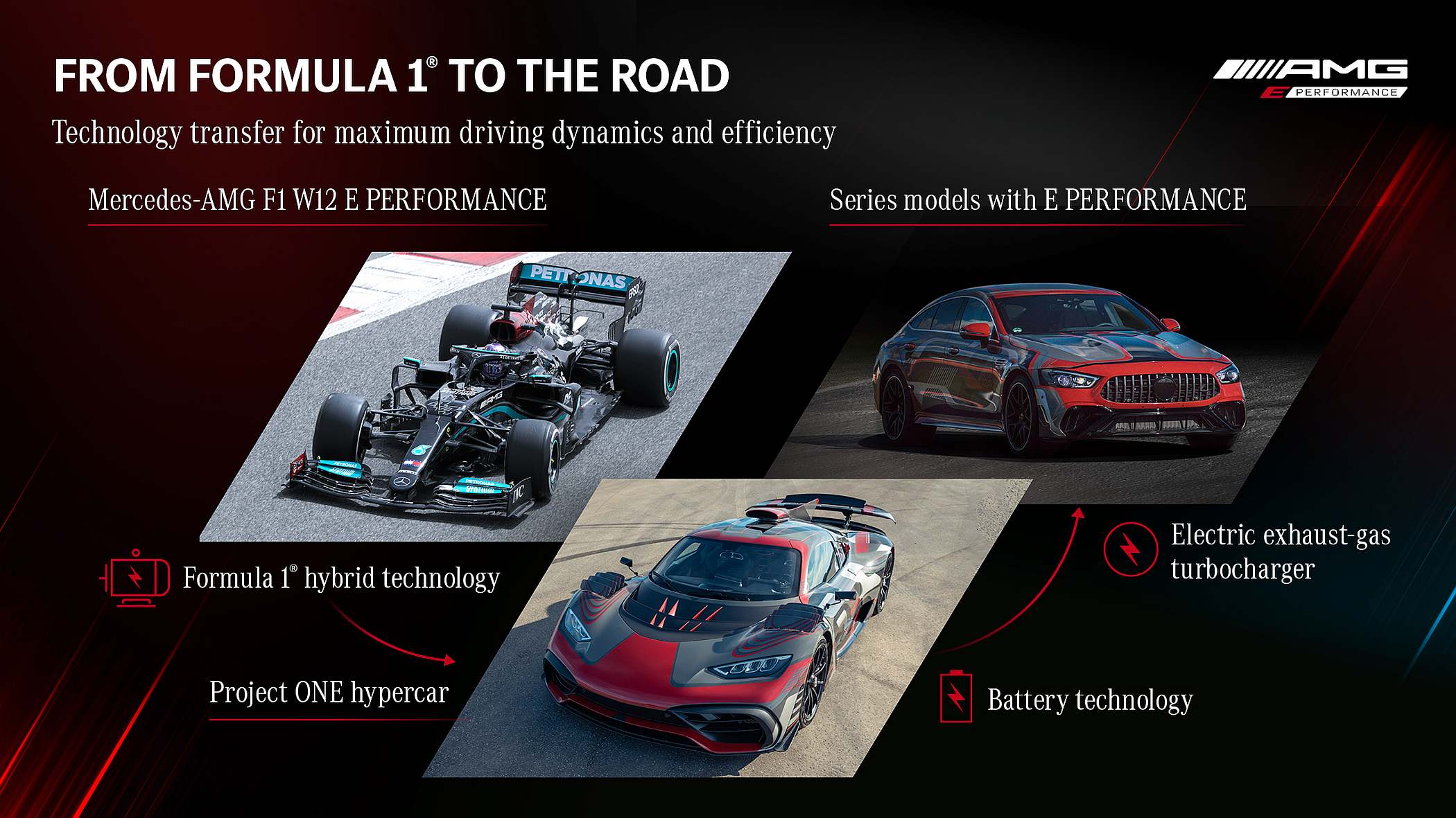Um dos resultados desse esforço será o já conhecido Project ONE, um hipercarro que transporta tecnologia diretamente retirada de um monolugar de Fórmula 1, mas a marca terá mais dois pilares: o dos modelos híbridos de alta performance com um conceito de motorização independente sob a denominação ‘E Performance’ e o dos AMG puramente elétricos, baseados nos modelos lançados sob a plataforma EVA para gamas de luxo e premium mas com alterações bastante extensas ao chassis, equipamento e design para se demarcarem dos modelos de base.